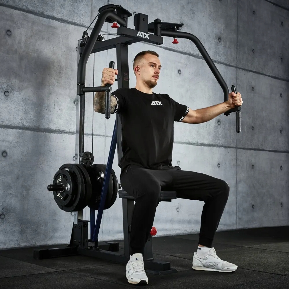 Нагрудна підставка ATX® PEC-650 | гарантує відмінний досвід тренувань завдяки першокласній біомеханіці та високоякісним компонентам. Візок для вільної ваги оснащений шарикопідшипниковими роликами, обертовими ручками та ексцентриковими плечами, також на шарикопідшипниках, що забезпечує комфортний і плавний процес тренувань. Спеціально розроблені ручки забезпечують оптимальний розвиток м'язів грудей і задніх дельт. 5-позиційне регулювання ручки дозволяє оптимально встановити початкове/кінцеве положення. Горизонтальне та два вертикальних положення рукоятки дозволяють точно націлити потрібну область м’язів.