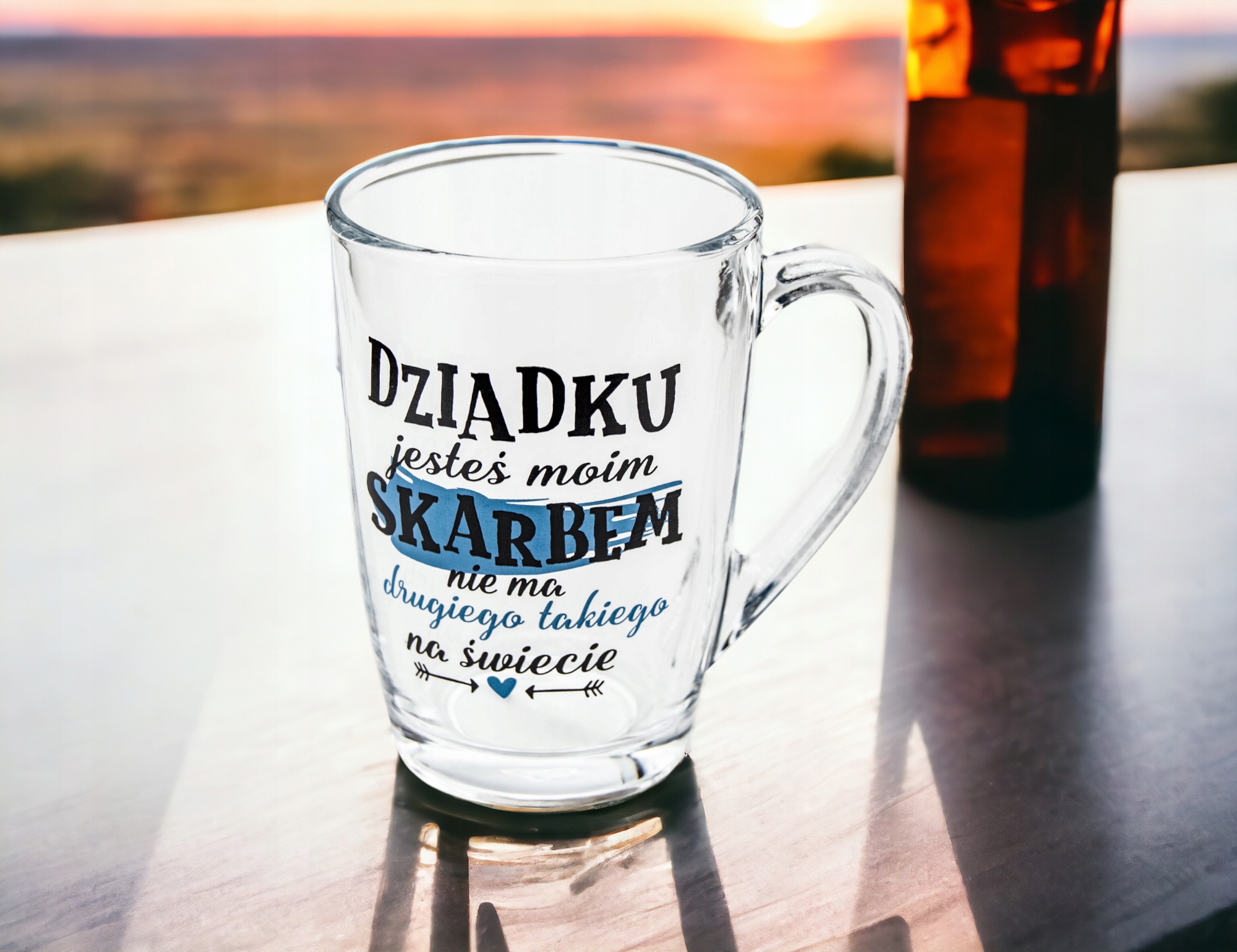 Кухоль з присвятою виготовлена з високоякісного, міцного скла, стійкого до подряпин. Зручна ручка, а також форма і чудовий розмір чашки роблять нею зручне використання. Елегантний і неповторний вигляд з принтом з особливими побажаннями - Дідусю, ти мій скарб, такого в світі немає. Чудово підійде на подарунок, наприклад, на День бабусь і дідусів.