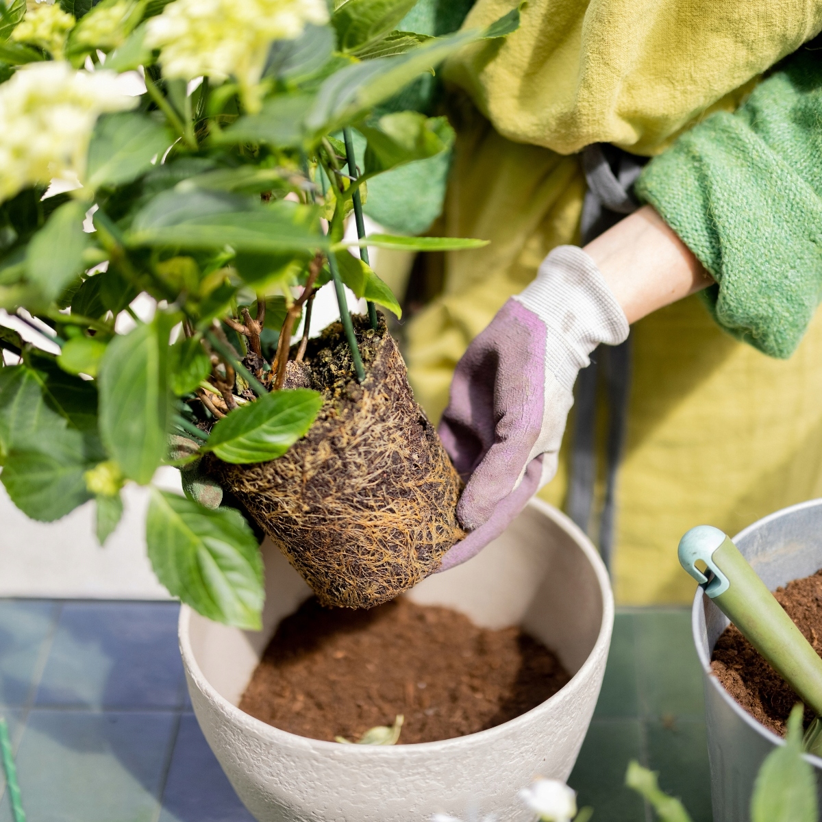 2️⃣ Обережно витягніть рослину з контейнера, потім закрийте коріння із ґрунтом