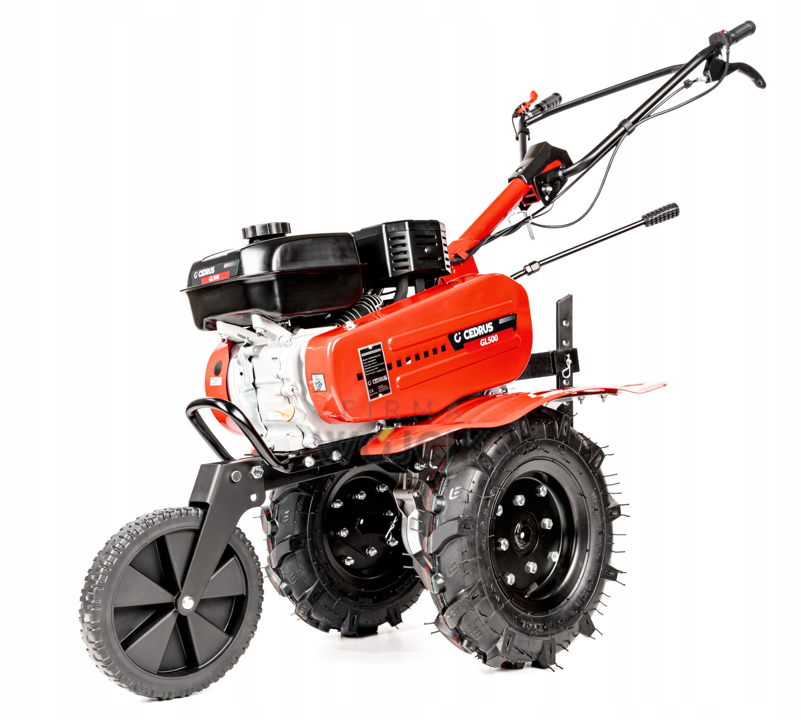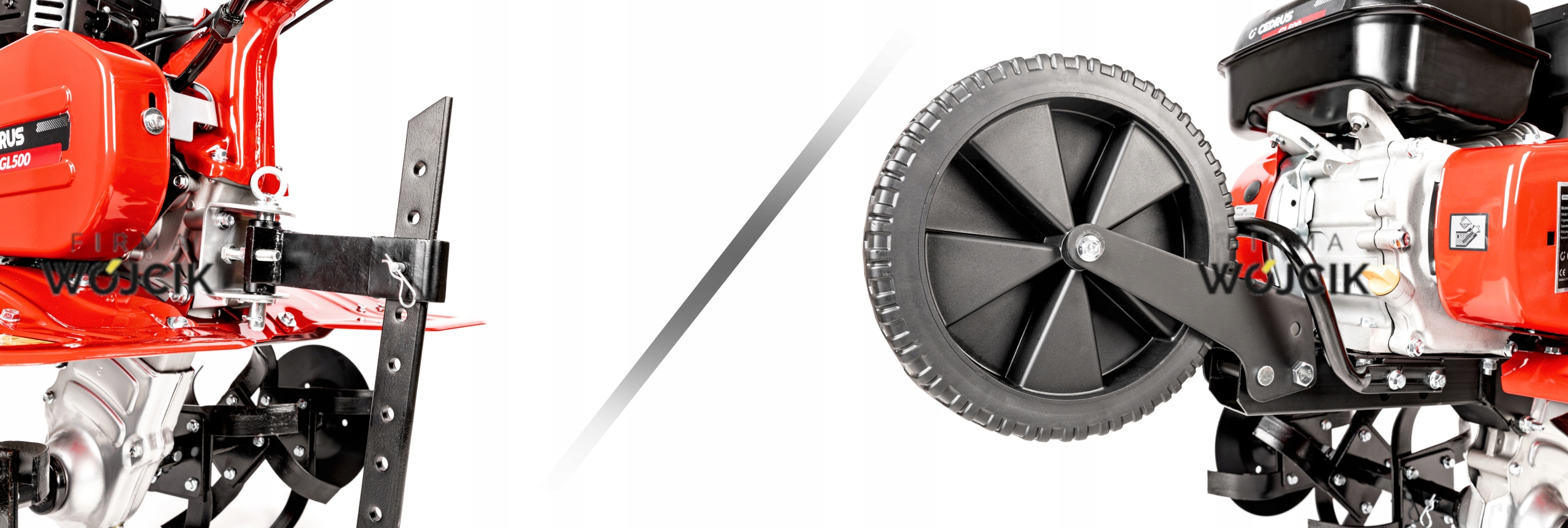 Бензинова фреза GL500 – це потужна і компактна машина, призначена для роботи в будь-яких умовах і в будь-який сад. Культиватор оснащений верхньоклапанним двигуном об'ємом 196 куб.см,з чавунною гільзою циліндра та масляним повітряним фільтром. Румпель має коробку передач, що дозволяє ножам працювати на двох швидкостях вперед і одній швидкості назад. У базову комплектацію та ціну машини входять гумові колеса, завдяки яким ми можемо швидко перетворити фрезу в мікротрактор, який може працювати з плугом, окучником або копачем.