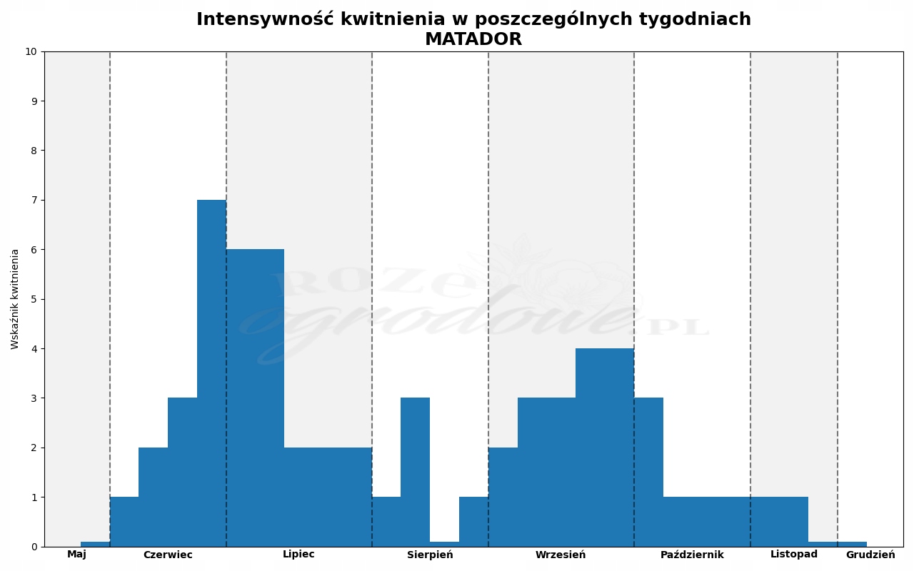 Цей дуже гарний яскраво-червоний колір Матадора стійкий і не вицвітає навіть на яскравому сонці. На щільних кущах досить рано з'являються дрібні напівмахрові злегка хвилясті квітки, які після відцвітання прибираються, а на їх місці безперервно з'являються нові до заморозків. Пагони закінчуються гігантськими суцвіттями, що складаються з півтора десятка квіток, усипаних великою кількістю молодих бутонів. Завдяки їм цвітіння розтягується в часі. Витончені квіти мають жовту серединку, яка є дружньою та привабливою длякомахзапилювачів.