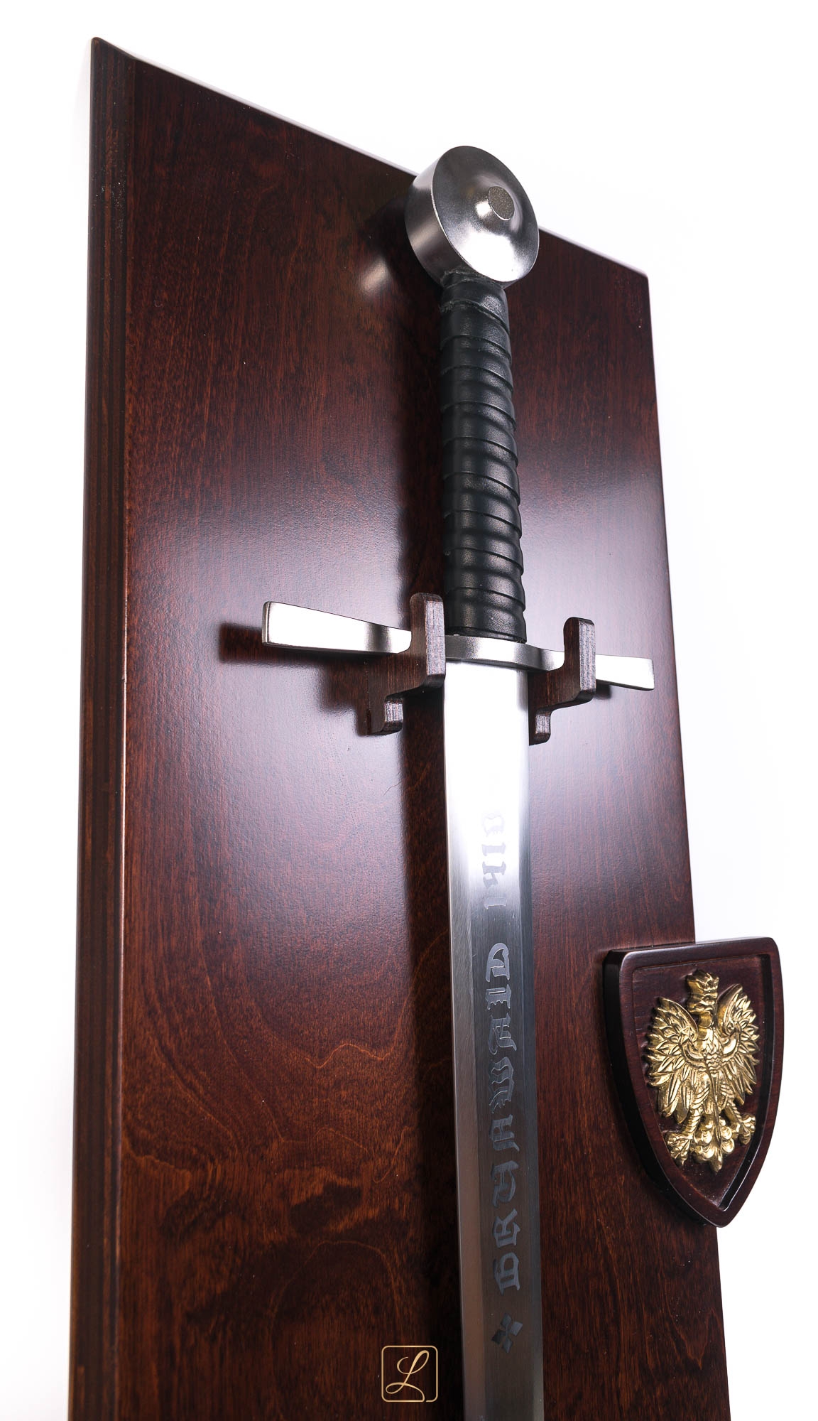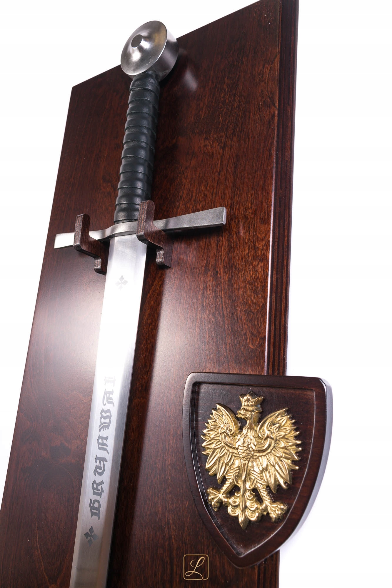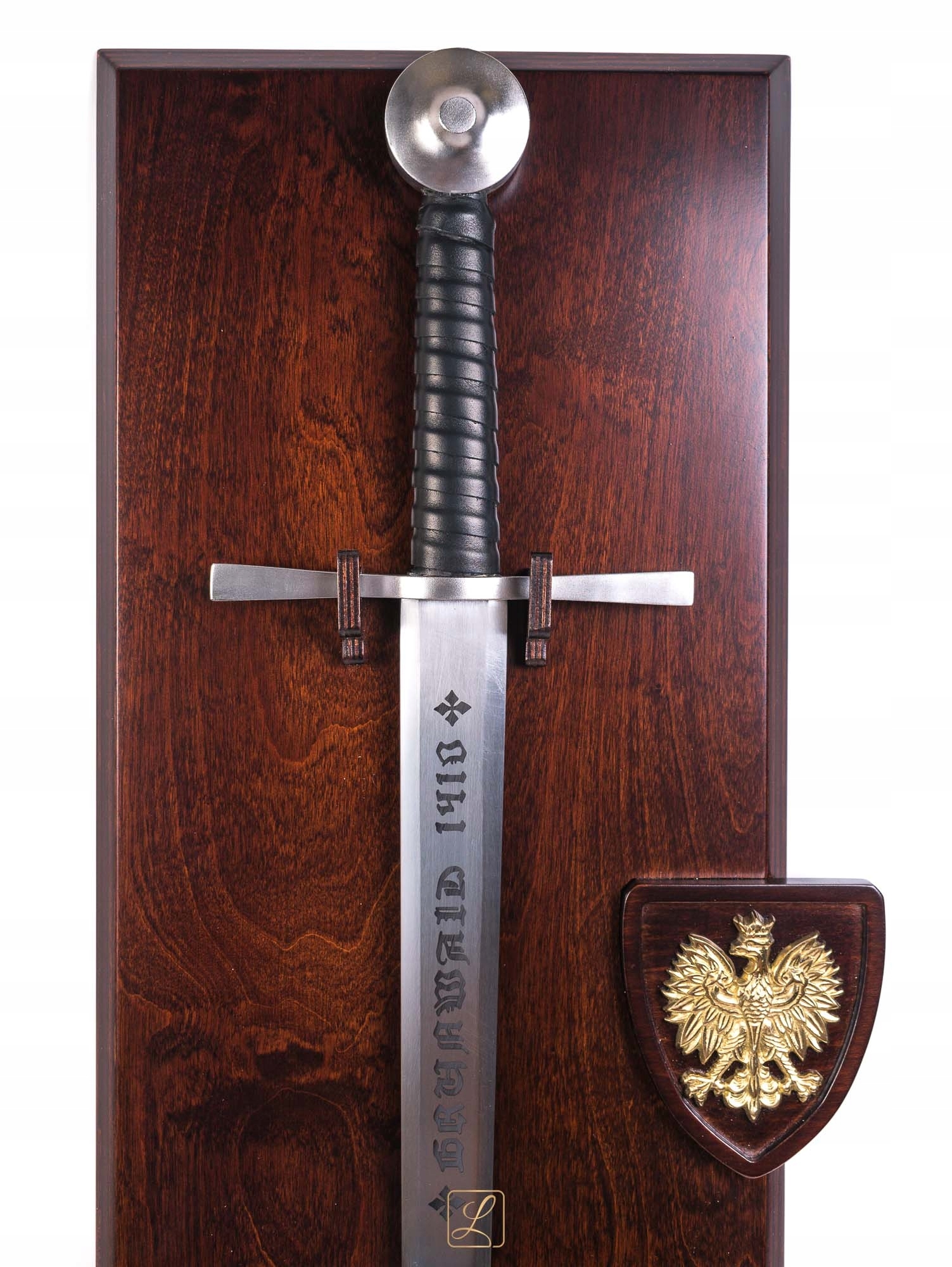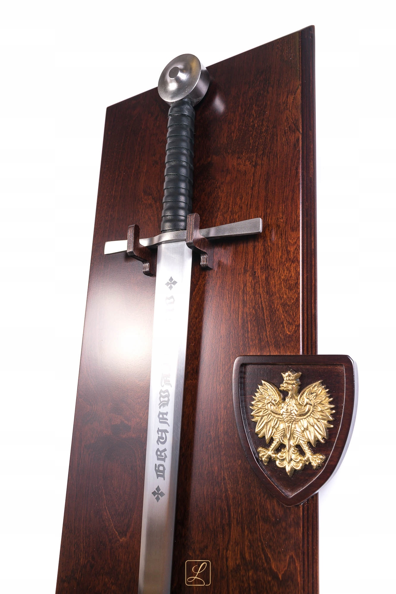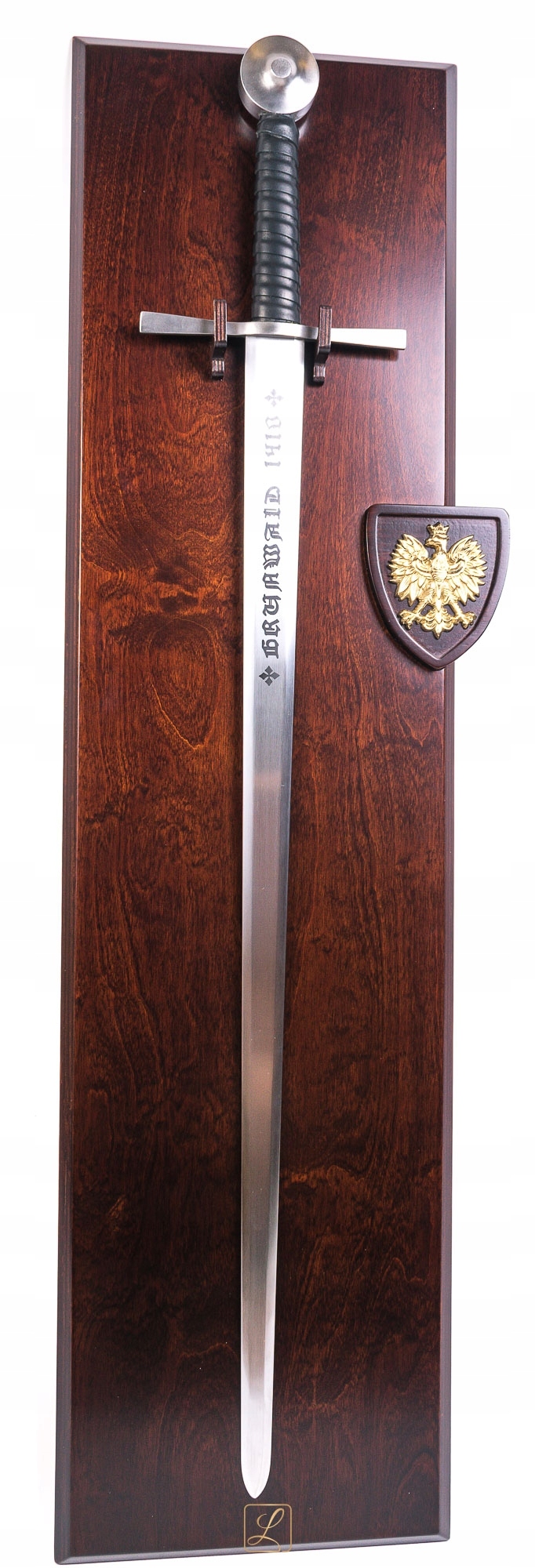 Вражаючий меч виглядає ідеально на прикріпленому табло. Товстий фанера Tablo, зроблений спеціально для цієї моделі меча, пофарбована та лакована для килима. З правого боку меча на дерев’яному гербі та в руках та в ньому латунна емблема Польщі - орел 9 см у відшліфованій версії. На задній частині столу два гачки, щоб повісити на стіну.