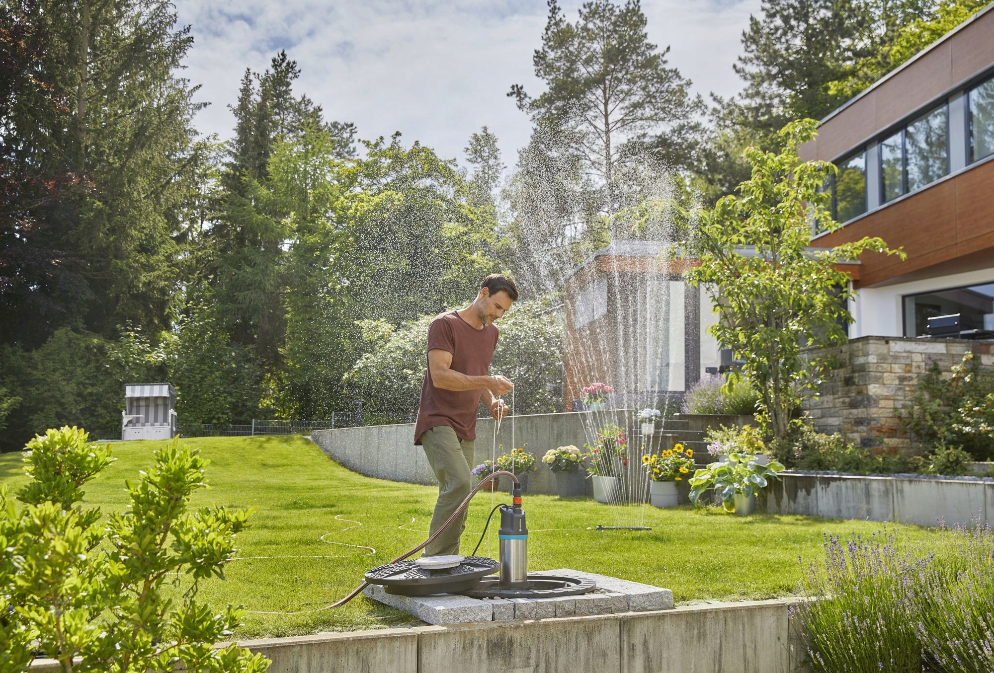 Автоматичний занурювальний напірний насос 6100/5 inox від Gardena - ідеальне рішення для власників садів середнього розміру, які зрошуються водою зі свердловини або цистерни. Насос можна занурювати на глибину до 17 метрів. Апарат оснащений двигуном потужністю 1100 Вт і дозволяє піднімати воду на висоту до 47 метрів. Ці параметри дозволяють одночасно працювати з чотирма спринклерами. Невеликі розміри означають, що насос можна використовувати у вузьких колодязях з мінімальним діаметром 15 см.