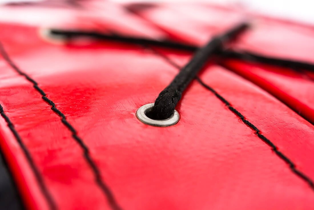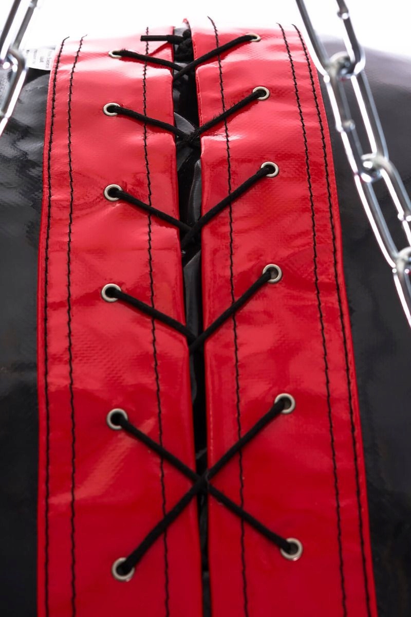 - Зав'язки на шнурівці - це найкращий варіант для закриття сумки. Зав'язки міцні, дірки оброблені нікельовані заклепки, які запобігають розширенню отвору шнурка. Крім того, під кріпленням є вставка, яка забезпечує герметичність боксерської груші - тому вам більше не доведеться хвилюватися, що начинка висиплеться під час тренування.