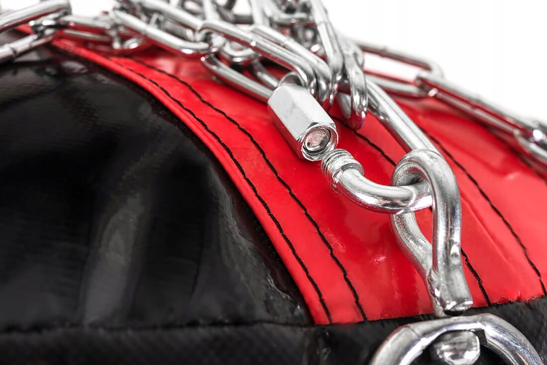 - Трикутне закінчення ланцюгів - оброблене трикутниками, завдяки чому стрічка не згортається і може вільно працювати на ланцюжку. Трикутники також забезпечують рівномірний розподіл тиску на ремені під час ударів. сумка. Крім того, він маскує місце вшивання ланцюжків у сумку, збільшуючи таким чином зону тренування, а також усуває травми та садна на шкірі.