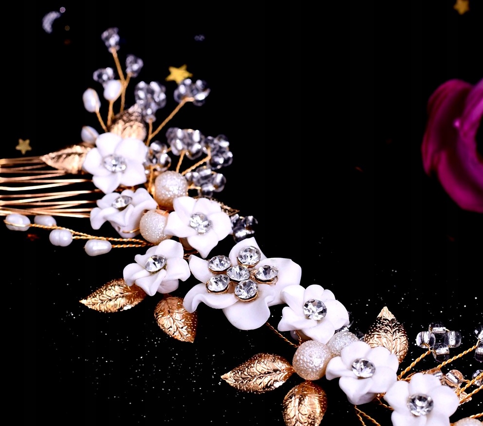 ✅ Гребінець виготовлений з високоякісні дроти золотистого кольору, прикрашені прозорими кристалами, білими перлами та красиво, добротно виготовленими квітами, схожими на порцеляну.