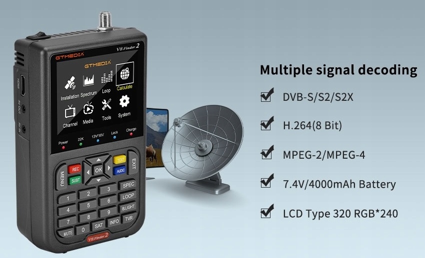 Компактний і легкий вимірювач супутникового сигналу, оснащений інтуїтивно зрозумілим інтерфейсом користувача. Завдяки вбудованому акумулятору він забезпечує тривалу роботу та доступ до всіх функцій, необхідних для встановлення та тестування цифрового супутникового телебачення як в односімейних, так і в багатоквартирних будинках.