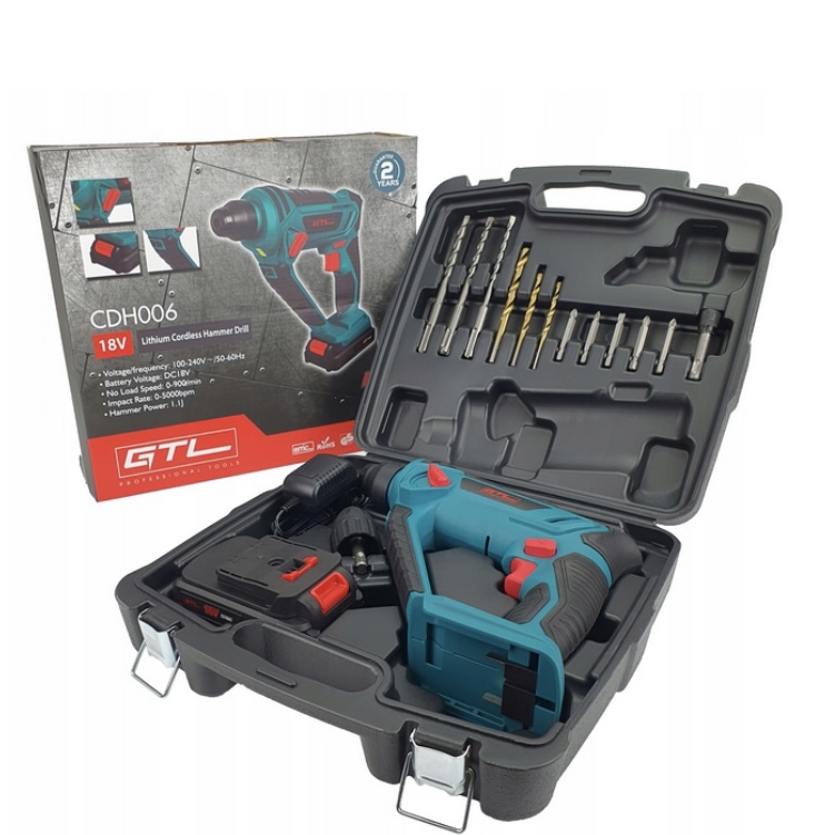 - Акумуляторна дриль GTL CDH006 має свердлильний патрон SDS+, який гарантує, що дриль не розб'ється під час роботи, і в той же час забезпечує більшу безпеку використання. У набір входить регульована свердлильна головка, яка дозволяє перетворити пристрій на повноцінний шуруповерт. Перемикач напрямку, який використовується в пристрої, можна використовувати для загвинчування та викручування різних типів шурупів.