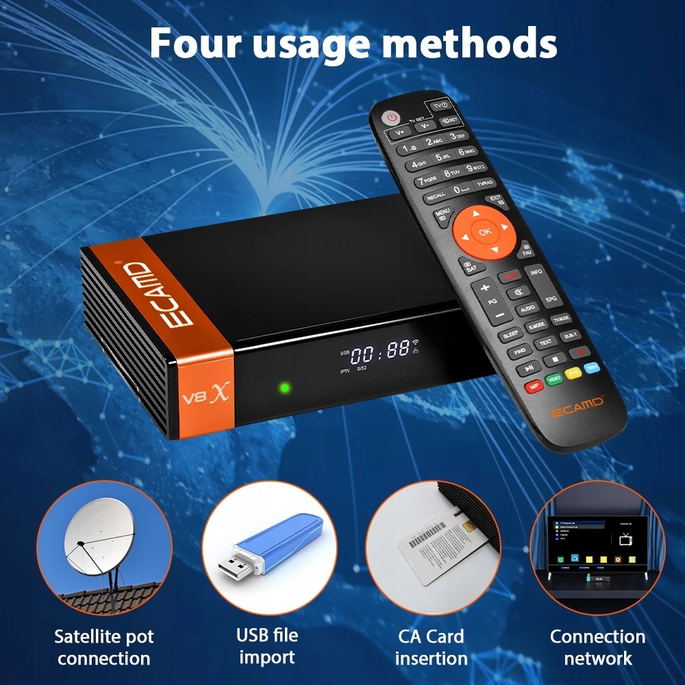 Супутниковий приймач ECAMD V8X DVB-S/S2/S2X, ACM, багатопотоковий, вбудований 2.4G WiFi, підтримка CA-карти