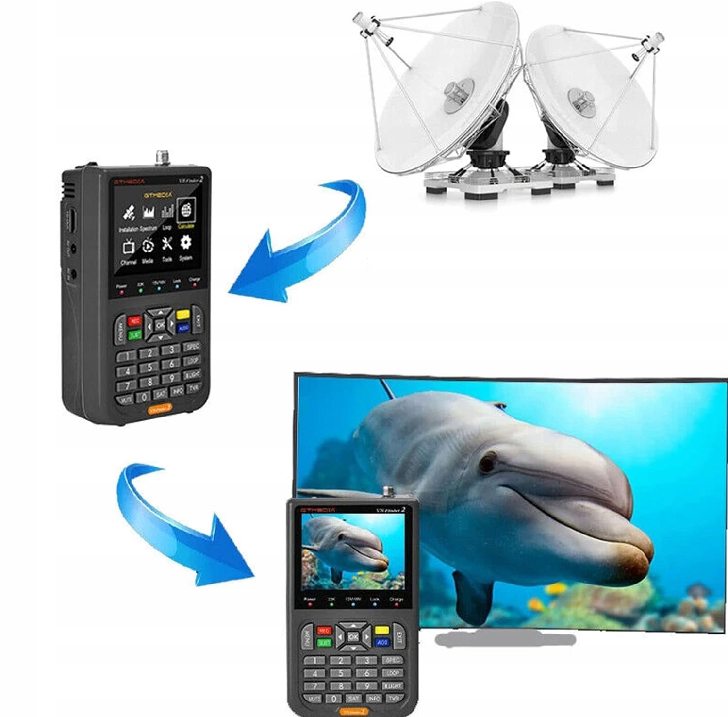 GTMEDIA V8 Finder 2 – це портативний супутниковий вимірювач, сумісний із DVB-S/S2 і MPEG-2/4 H.264 (8 біт). Завдяки компактним розмірам, малій вазі, інтуїтивно зрозумілому інтерфейсу користувача, довгому ресурсу батареї та багатому набору функцій лічильник забезпечує всі функції, необхідні для встановлення та перевірки послуг цифрового супутникового телебачення в будинках або багатоквартирних будинках.