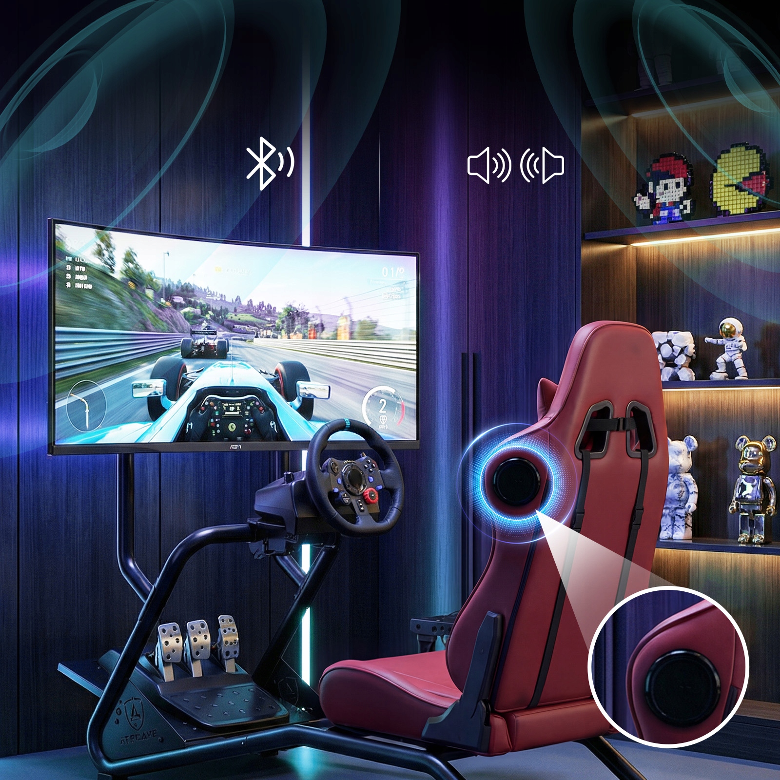 3D-динаміки: динаміки встановлюються з обох боків від підголівника, і їх положення регулюється разом із підголівником і сидінням, гарантуючи, що звук завжди оточує голову користувача для оптимального налаштування об’ємного звукового поля.
