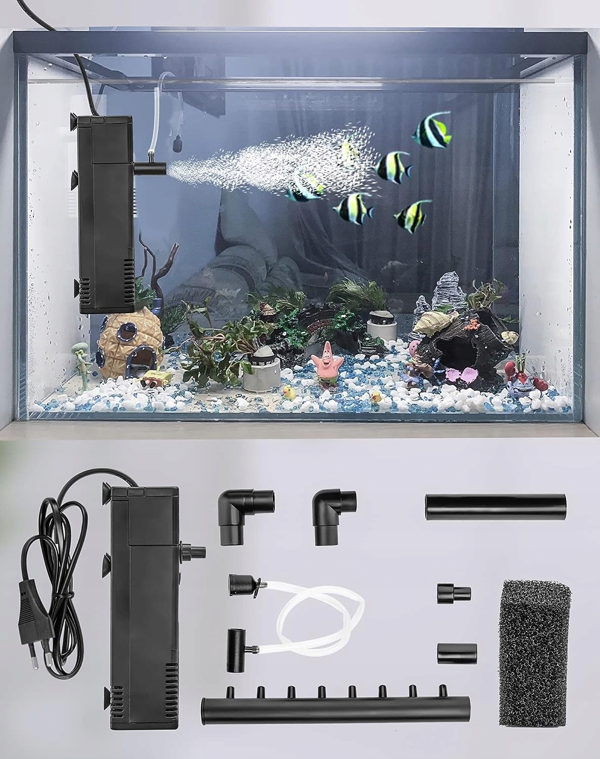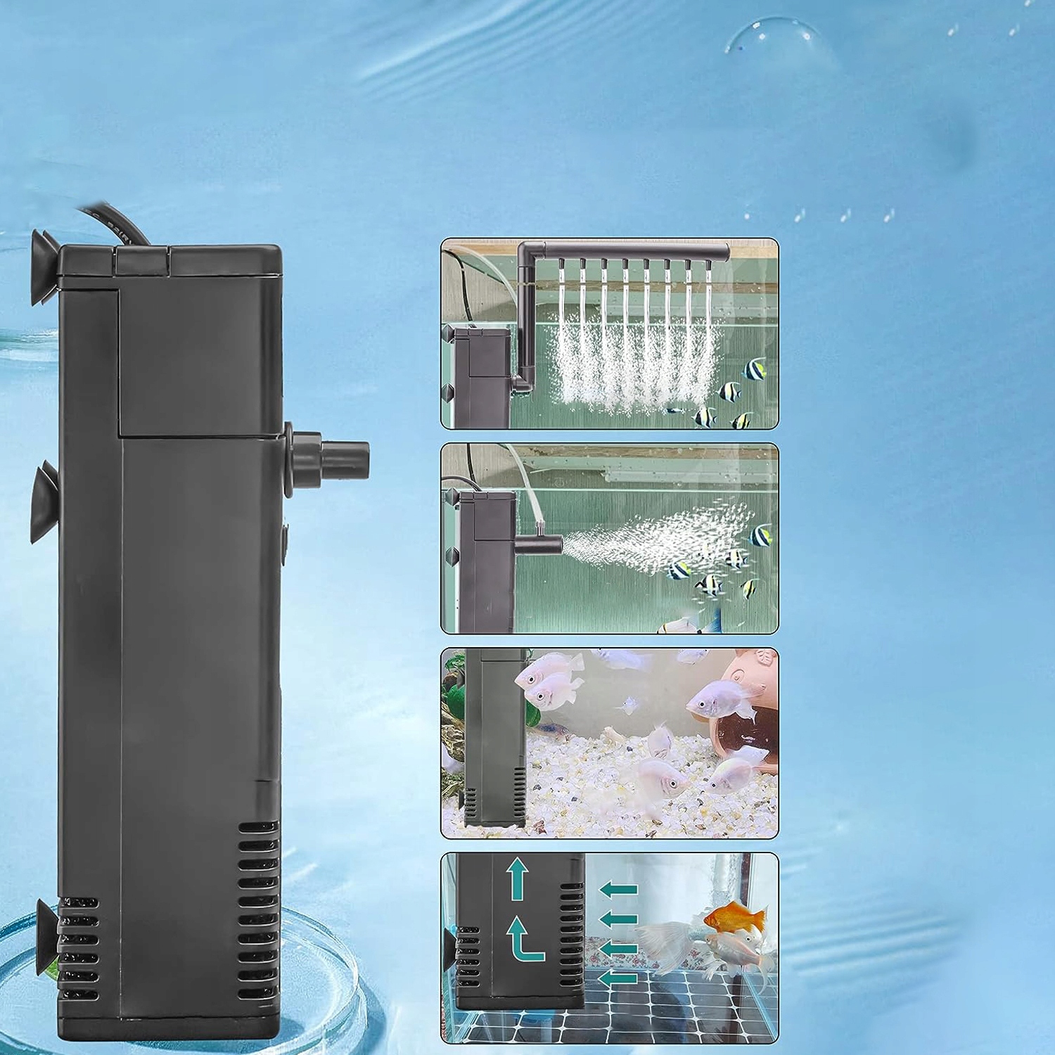 ☑️Багатофункціональна та фільтруюча губка:вбудований акваріумний фільтр Цей акваріумний фільтр можна використовувати для фільтрації, циркуляцію, оксигенацію та створення хвиль і підходить як для прісної, так і для солоної води. Крім того, у фільтруючому середовищі використовуються ультратонкі фільтруючі губки, які можуть ефективно фільтрувати екскременти риб, залишки корму для риб і дрібні предмети. Цей фільтр також безпечний для молодих креветок і риб завдяки вузькому всмоктувальному отвору та дуже дрібним порам губки попереднього фільтра.