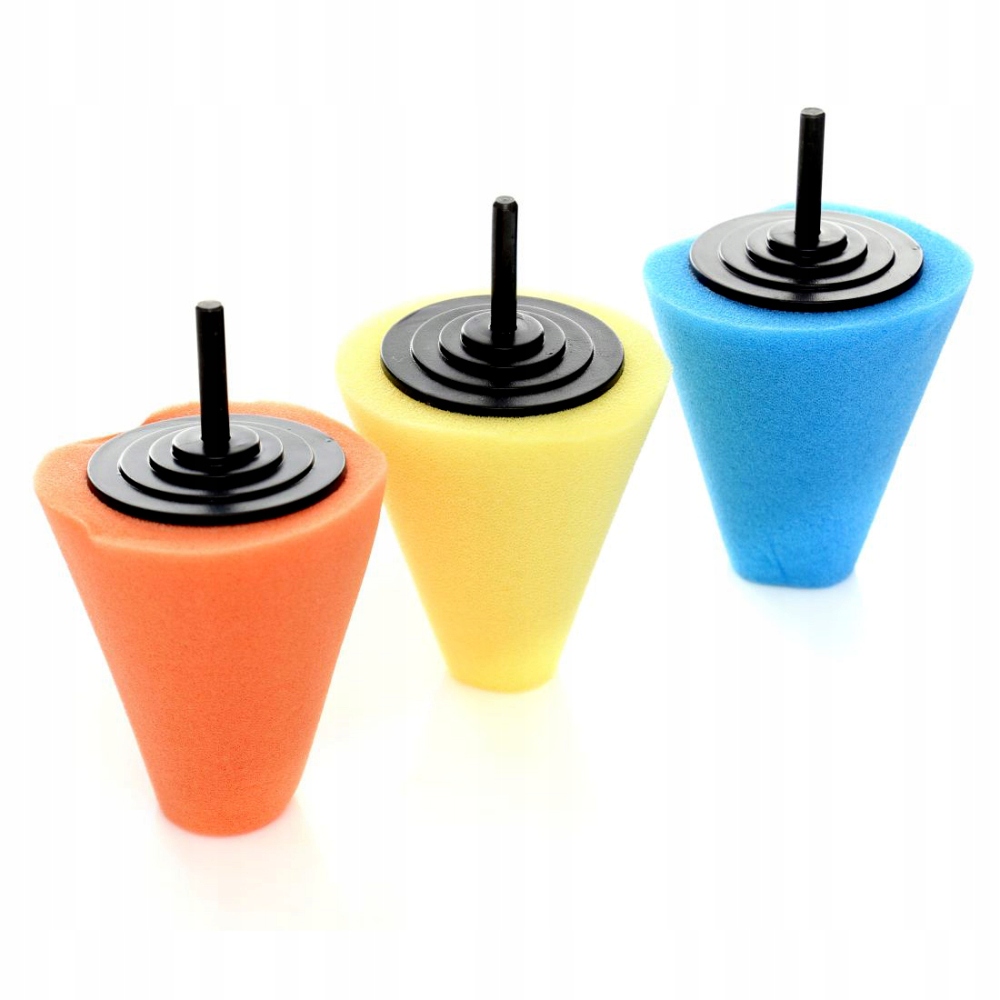 Поролонові полірувальні конуси, позначені кольором залежно від ступеня твердості, призначені для ремонту фарби на невеликих поверхнях. Вони також ідеально підходять для полірування важкодоступних ділянок, таких як виїмки обода, наконечники вихлопної системи тощо, ретушування подряпин, бризок, пошкоджень фарби, слідів від наждачного паперу P1200/1500 і сильного окислення в поєднанні з густою коригуючою пастою для багатоетапного полірування. . Крім того, для одноетапного полірування до остаточного блиску та остаточного полірування до абсолютного блиску, а також для нанесення рідких восків і консервантів.