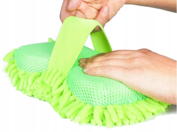 - Дуже вбираюча, двостороння губка з мікрофібри, призначена для миття автомобіля. Спеціальна поверхня з отворами на зворотному боці губки призначена для видалення комах зі стекол автомобіля або більш сильного бруду. Гумка фіксує вашу руку до губки і не спадає під час змітання під час прання