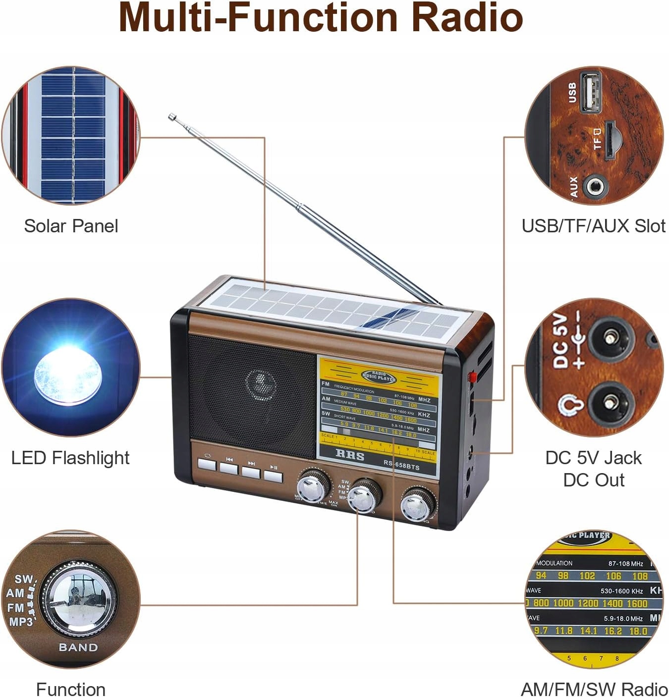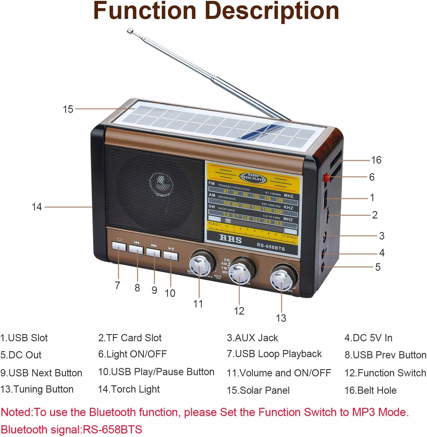 Багатофункціональність: це радіоприймач на сонячних батареях AM/FM/SW DSP, водночас він розроблений із Bluetooth, слотом USB, слотом для карти пам’яті пам’яті, вхідним джерелом світла, ліхтариком. Це приносить вам новий досвід і робить ваше життя яскравішим.