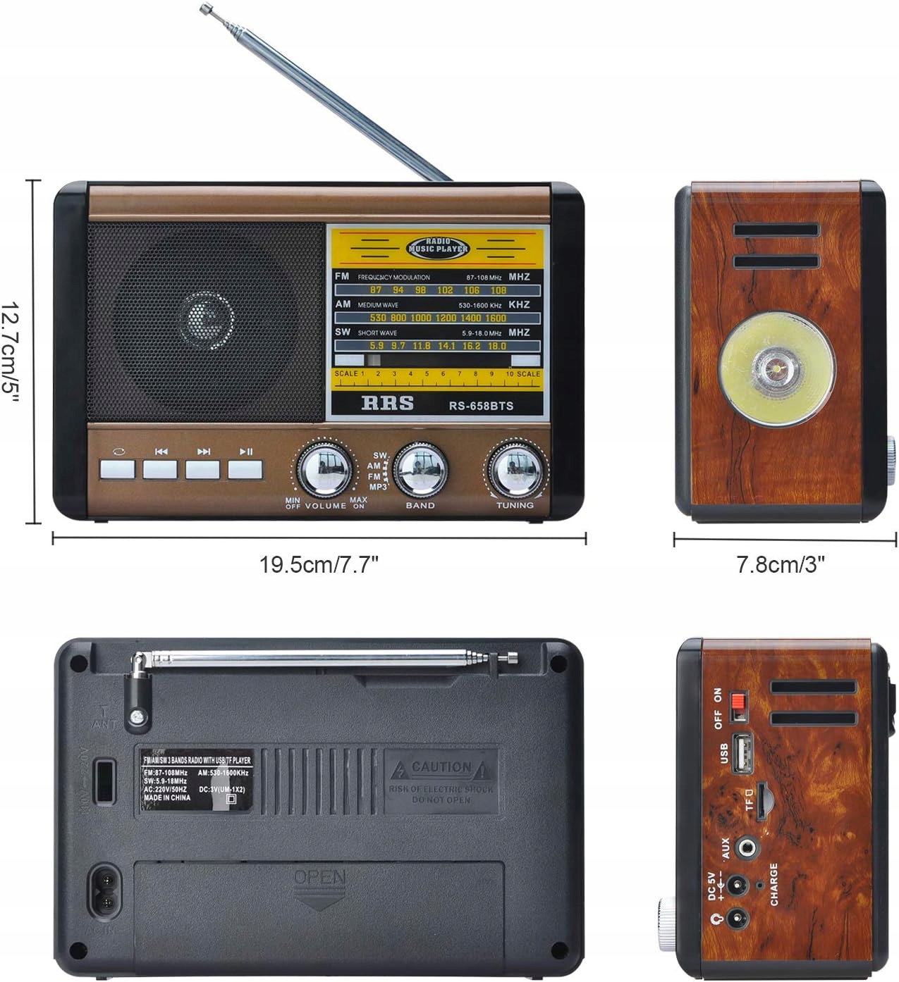 Дизайн у стилі ретро: Розмір цього радіо становить 19,4*12,5*8,5 см. Розроблений із зовнішньою телескопічною антеною та динаміком Hi-Fi, він робить радіосигнал сильнішим і стабільнішим, а також робить звук чіткішим і кращим. Поставляється з ремінцем, що дає змогу зручніше носити його, підходить для прослуховування в приміщенні та активного відпочинку, наприклад приготування їжі, читання, кемпінгу, риболовлі тощо.