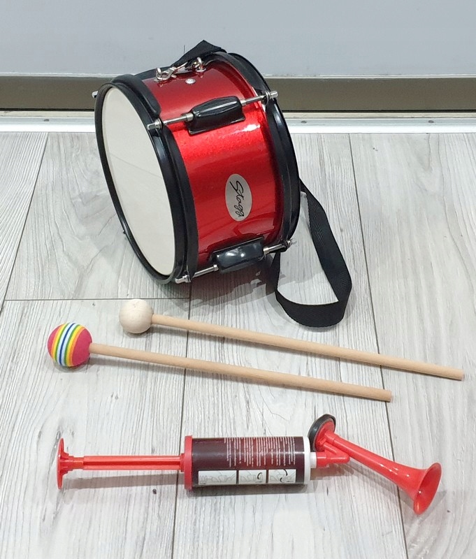 рядки в дуже хорошій стані без будь -яких пошкоджень. Набір - це пояс, дві палички, ключ налаштування барабана та нова труба підтримки.