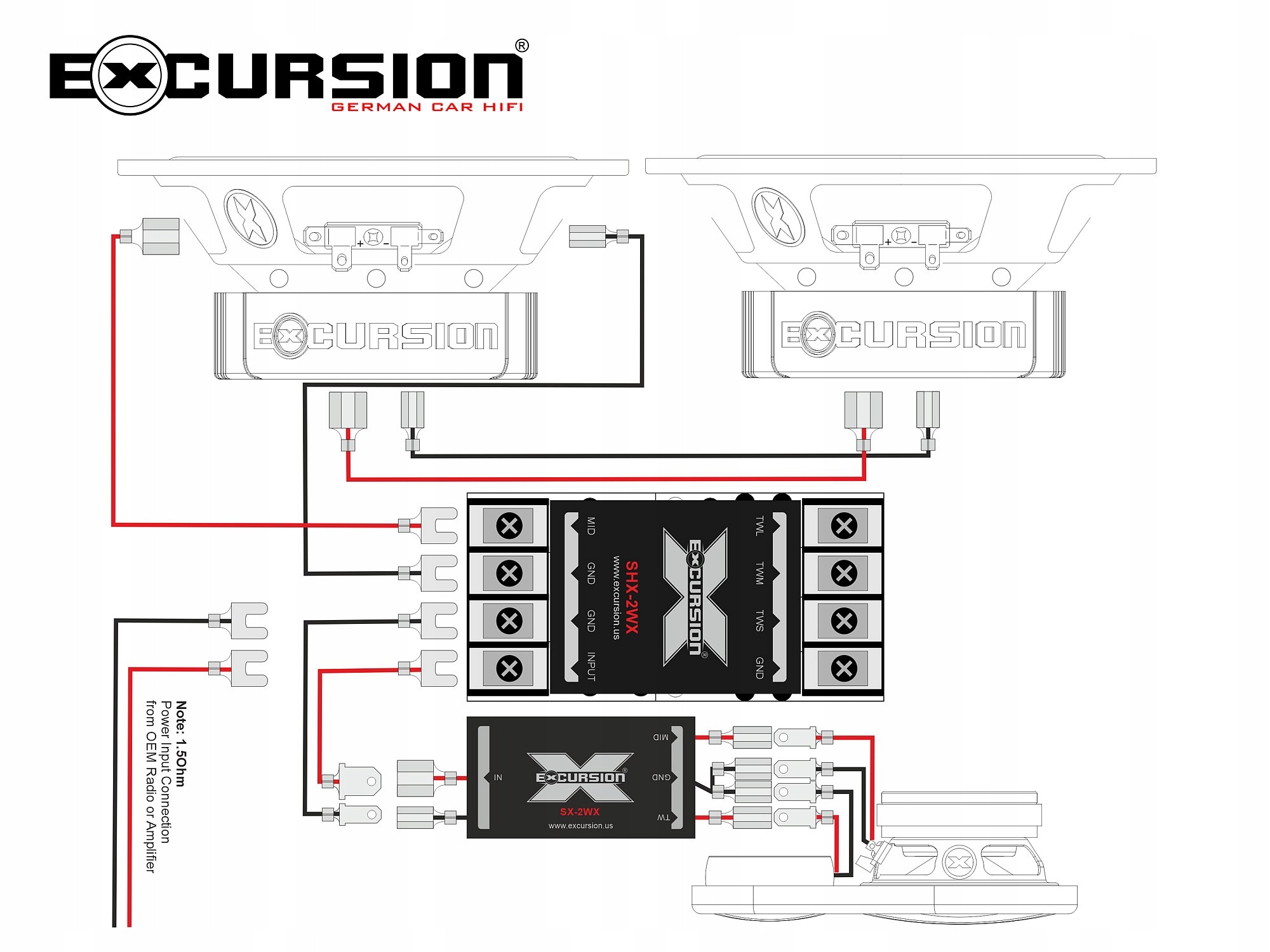 - У комплекті з 4 низькочастотними динаміками можна використовувати два варіанти підключення, використовуючи 4 або 6 кросоверів. Варіант-1 (4 кросовери) - пара паралельно з’єднаних НЧ-динаміків живляться через загальний фільтр LPF від одного кросовера SHX-2WX (фільтр HPF від цього кросовера не використовується). Так само друга пара НЧ-динаміків. Варіант-2 (6 кросоверів) - кожен НЧ-динамік живиться незалежно через окремий LPF від чотирьох окремих кросоверів SHX-2WX (фільтри HPF цих кросоверів не використовуються). У кожному з наведених вище варіантів набір гучномовців середнього діапазону SX-SAT повинен отримувати живлення від двох окремих кросоверів SX-2WX (фільтри TW/MID). Варіант 2 є більш нейтральним за звуком, оскільки опір 3 Ом кожного низькочастотного динаміка, підключеного до окремого кросовера, не змінює частоту кросовера фільтра LPF.