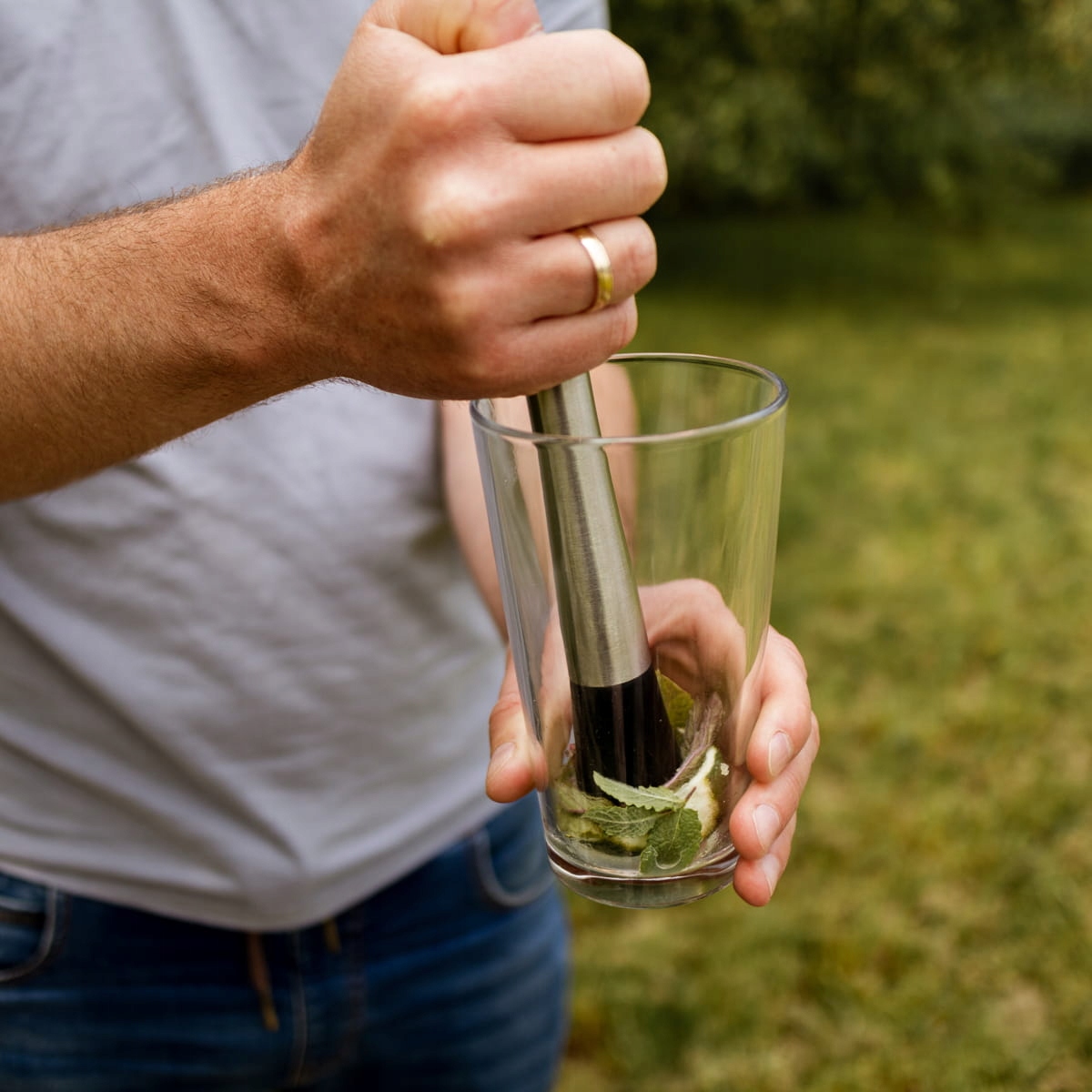 4 замішні шматки вапна з тростинним цукром у мохіто або шматочками імбиру в пеніциліновому напої.Завдяки використанню гуддлера ми збагачуємо напій соками та ефірними масел із свіжих фруктів та ароматів, витягнутих з трав. Це покращить смак та збагатить аромат наших напоїв! Ми це ідеально знаємо, тому що ми самі використовуємо цей гудлер, коли готують напої!