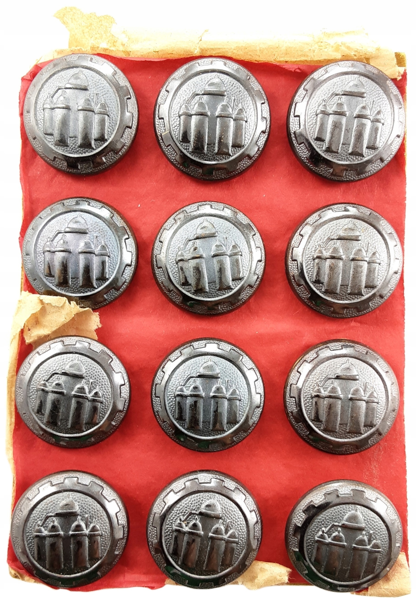 Гудзики уніформи, неідентифіковані, ймовірно пов'язані з важкою промисловістю, вироб. Німеччина, штати монетного двору, витягнуті з картону виробника, двошарові, аверс із зображенням фабрики, вписаним у зубчасте колесо, сталеві реверси, підпис «EXTRA FEIN».
