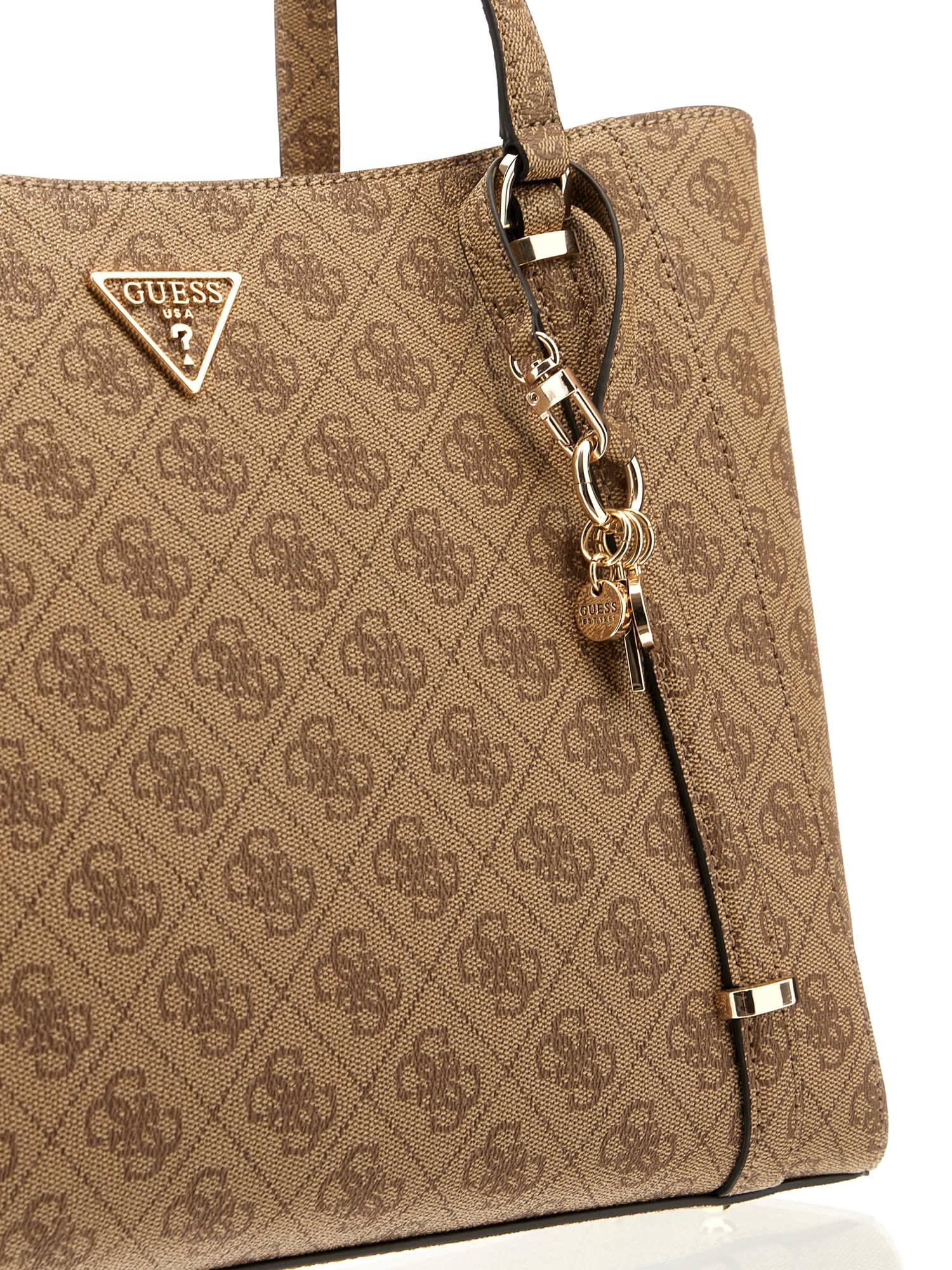 - Логотип: на поверхні сумки є логотипом 4G, спереду опуклий трикутник з написом «GUESS USA» з «?» знак, всередині металевий значок на шкіряній нашивці. з написом "GUESS EST.1981", написом "GUESS" вигравіруваним на блискавці, написом "GUESS", "GUESS 1981" і літерою "G" вигравіруваним на кільці для ключів, написом "GUESS" на підкладці