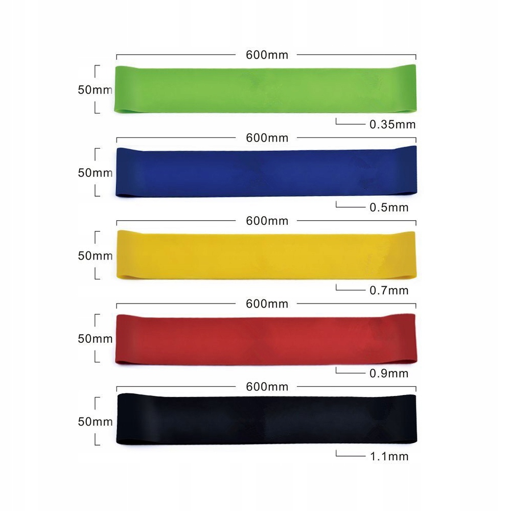 Товщина стрічки впливає на силу, необхідну для розтягування більш товстого. The color of the tape at the same time means the scale of resistance (in brackets resistance in kg):