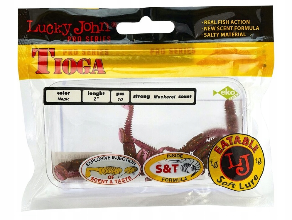 Tioga — приманка, розроблена спеціально для лову окуня та судака. Унікальна форма тіла забезпечує рухи у воді, які створюють коливання, що приваблюють хижаків. Бічні ребра підсилюють дію приманки, забезпечуючи її «живі» рухи. Гібридна приманка має червоподібне тіло з характерним потовщенням спереду і невеликим кігтистим хвостиком. Приманка має привабливий аромат скумбрії. Tioga 5.1 і 6.1 см - найкращі приманки для мікроджигів, їх можна кріпити як на джиг-головку, так і на офсетний гачок. Більші приманки Tioga 9,9 см ідеально підходять для класичного джигу, а 7,5 см Tioga можна успішно використовувати для багатьох різних сетів з грузилом. Найменші приманки привертають увагу окуня, ротангового бичка та інших мікроджигових риб.