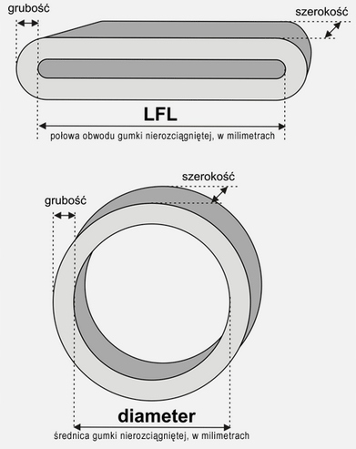 Уявімо, що ми беремо в руки одну гумку. Вставляємо вказівні пальці обох рук в центр гумки і розводимо руки в сторони до відчуття опору. Таким чином, приблизно звичайно, ми визначили половину окружності нерозтягнутої гумки. Чому приблизно? Наші пальці мають певну товщину. На практиці для вимірювання використовується точний штангенциркуль, штифти якого значно тонші й дозволяють проводити набагато точніші вимірювання. Розмір, який ми вимірюємо таким чином, називається половиною окружності нерозтягнутої еластичної стрічки, тобто LFL (Lay Flat Length) і виражається в міліметрах (мм). Важливо: детальне вимірювання, результат якого наведено на упаковці, враховує розмір, виміряний зсередини (де наші пальці), а не зовні.