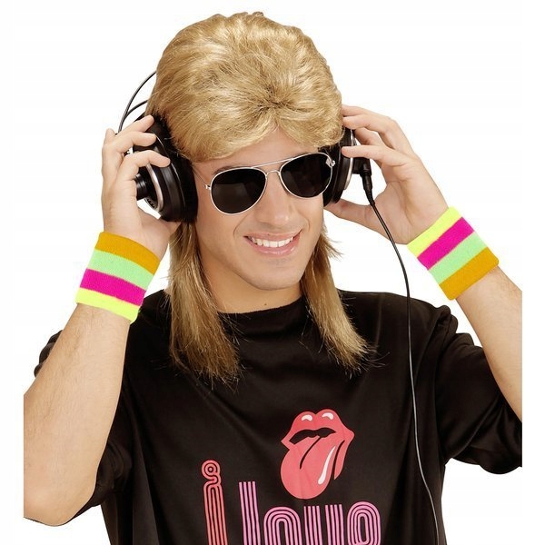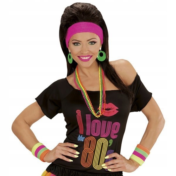 рожеві та зелені козирки, неонові перуки, намистини, браслети та сітчасті рукавички різних кольорів, костюми 80-х