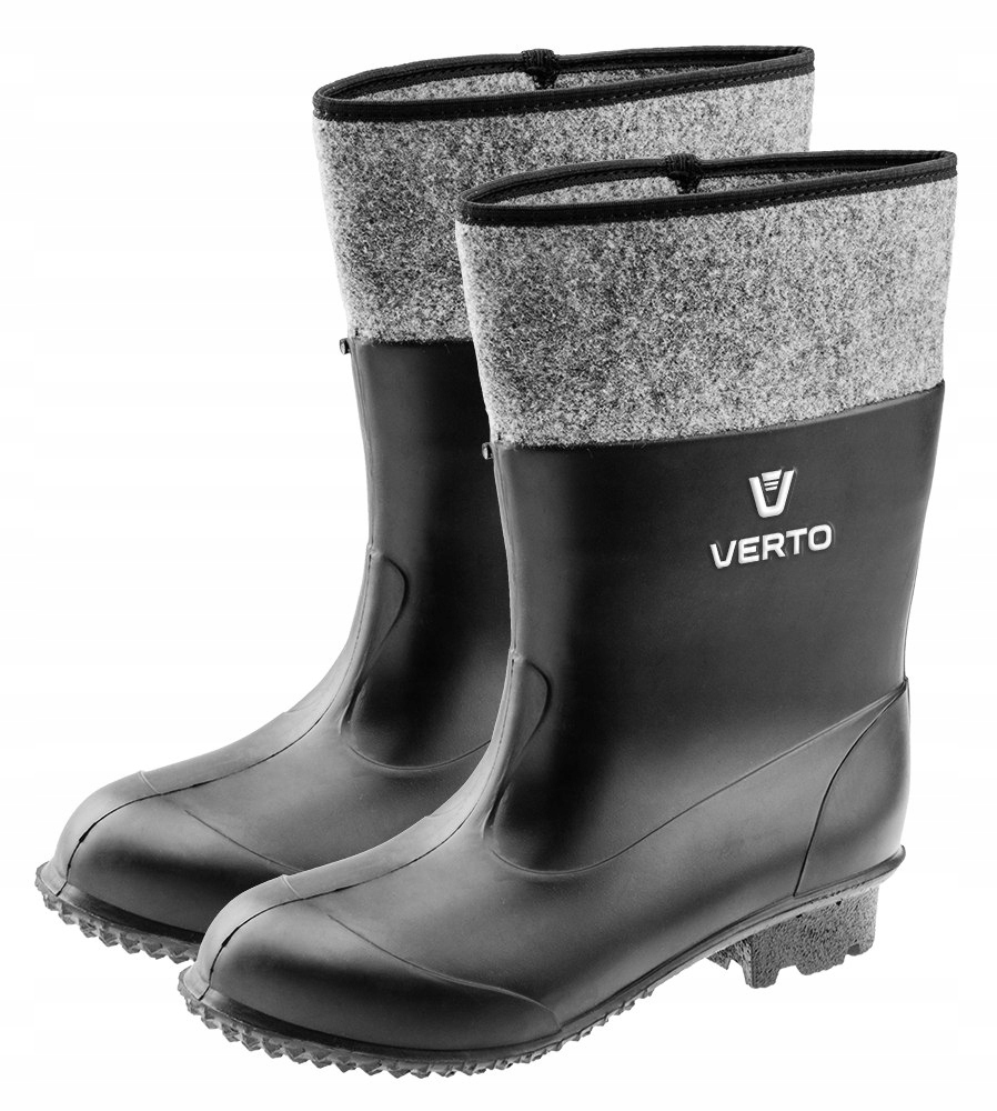 Гумові стрічки VERTO (арт. № 15G905), розмір 44. Виготовлені з пластику, верх і низ водонепроникні. Внутрішня частина взуття наповнена повстяною підкладкою, що забезпечує комфорт і оптимальний стан для стопи. Антиковзаюча підошва з холодоізоляцією та стійкістю до солярки забезпечує безпеку та комфорт під час роботи. Гумки мають сертифікат CE.