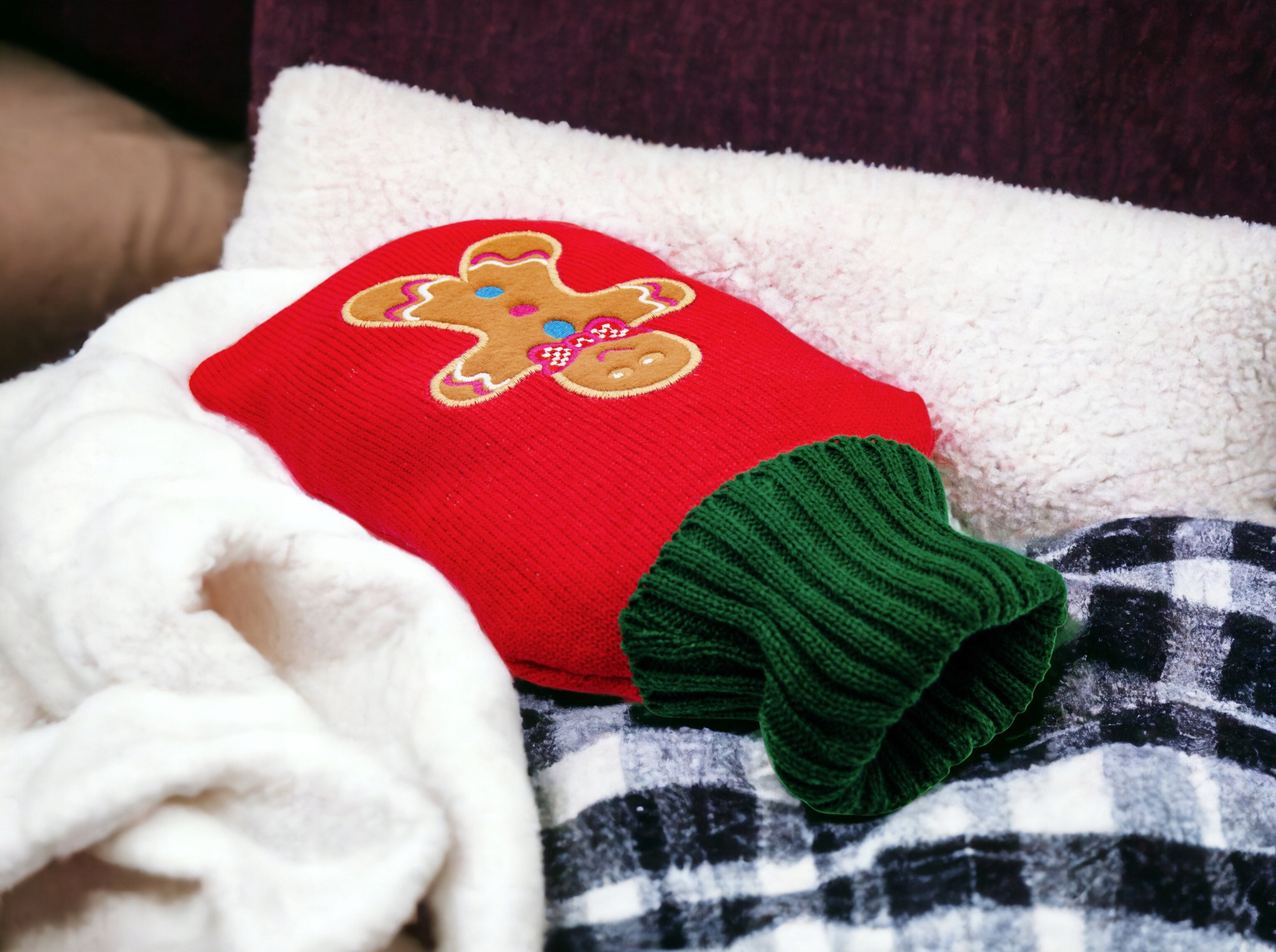 - грілка в біло-сірій кришці з пряниковим візерунком.