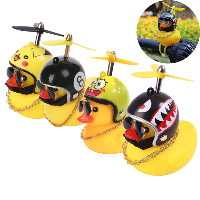 Кожне гумове каченя оснащене шоломом, пропелером, світлодіодним вібраційним ліхтарем, ремінцем для велосипеда, автомобілем. наклейка, намисто та окуляри.