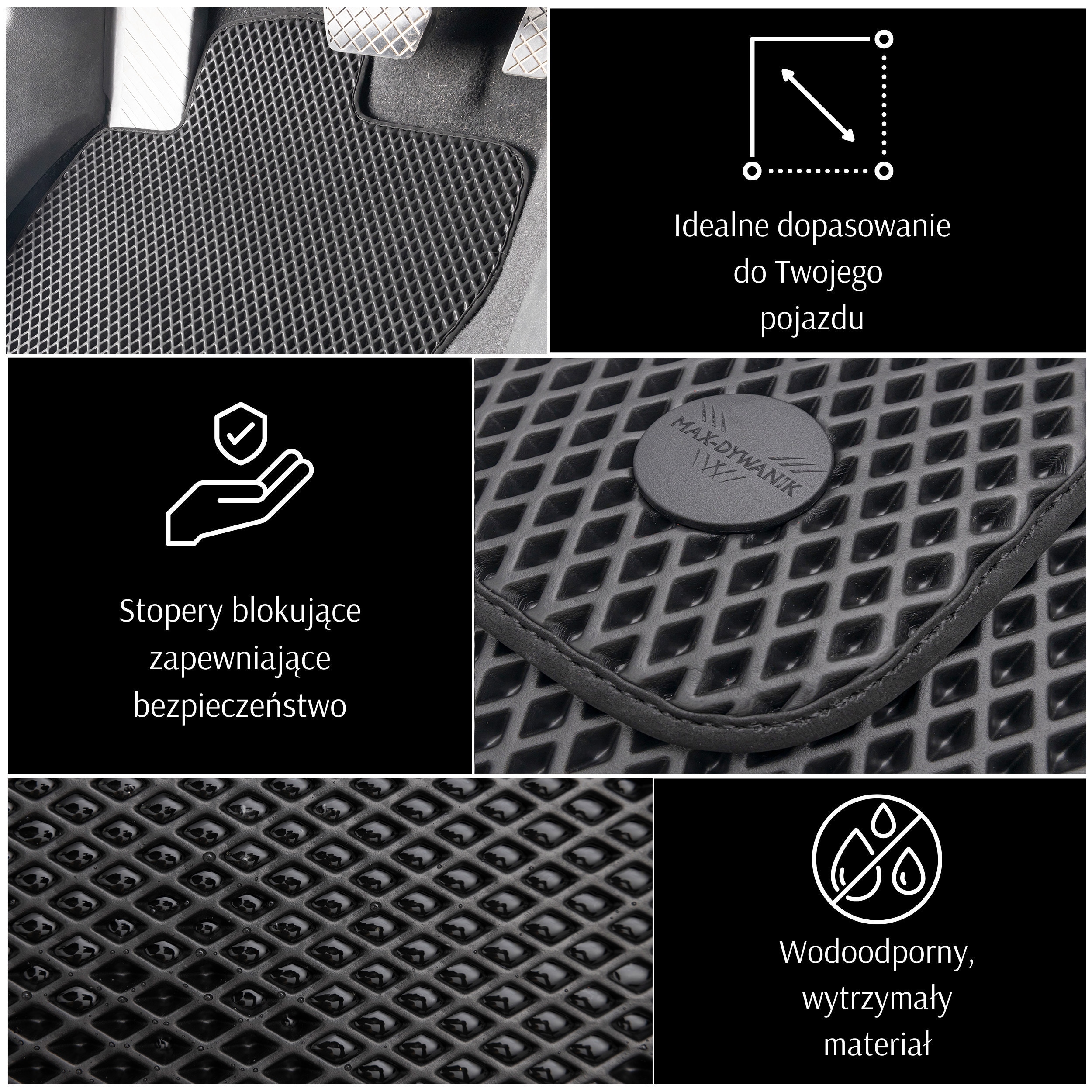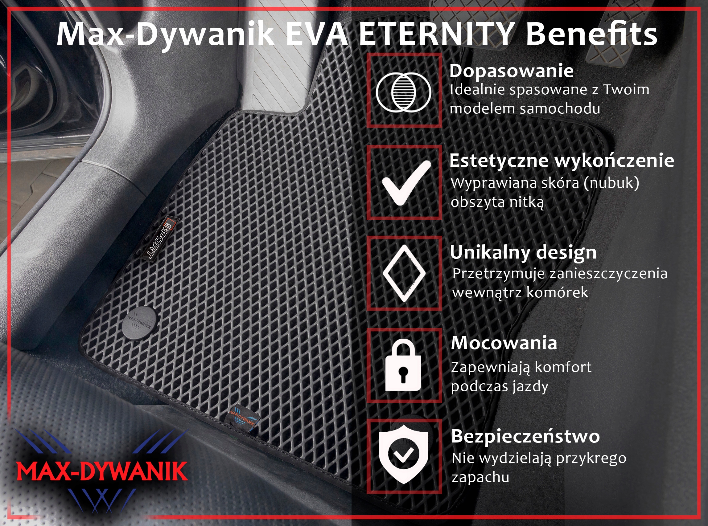 Подаруйте вашому автомобілю найвищий рівень захисту та стиль за допомогою наших ексклюзивних EVA ETERNITY DEEP MATS. Виготовлений з високоякісної піни EVA товщиною 10 мм і має структуру ромба. Наші килимки не тільки функціональні, але й додають елегантності салону вашого автомобіля завдяки гелевим емблемам SPORT , розробленим MAX-DYWANIK, які підкреслюють їх зовнішній вигляд.