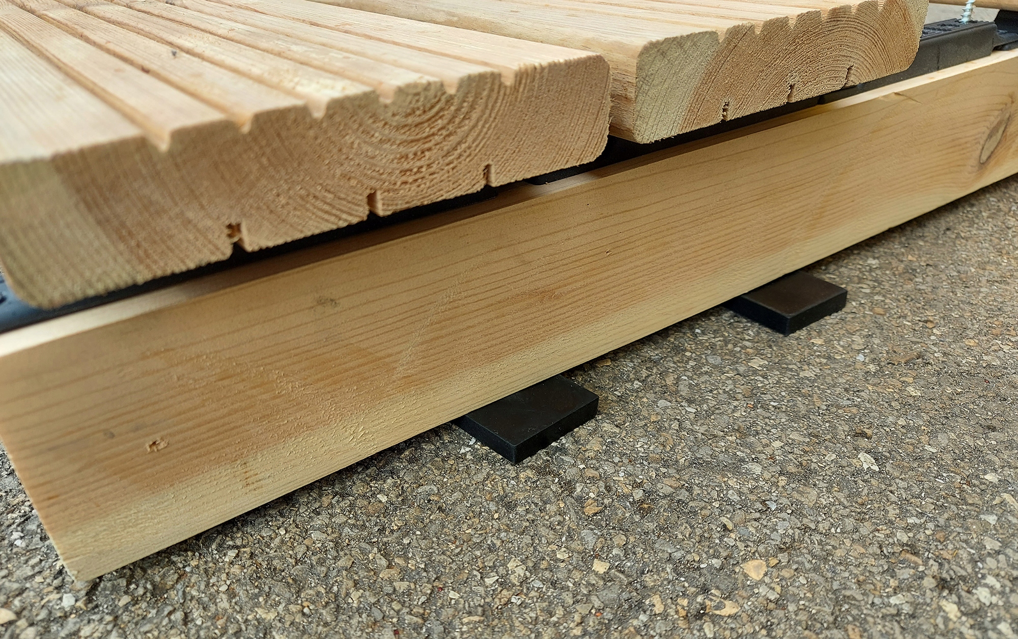 Трасні балки, які лежать і безпосередньо торкаються одна одної, схильні до гниття. Внаслідок постійного вологого контакту між деревиною та землею виникають пошкодження, які перешкоджають безпечному використанню тераси. Застосування гумових прокладок під лаги тераси дозволяє продовжити термін служби балок. Крім того, гумові накладки мають звукоізоляційні властивості, а це означає, що тераса буде тихою у використанні та не пропускатиме вібрації.