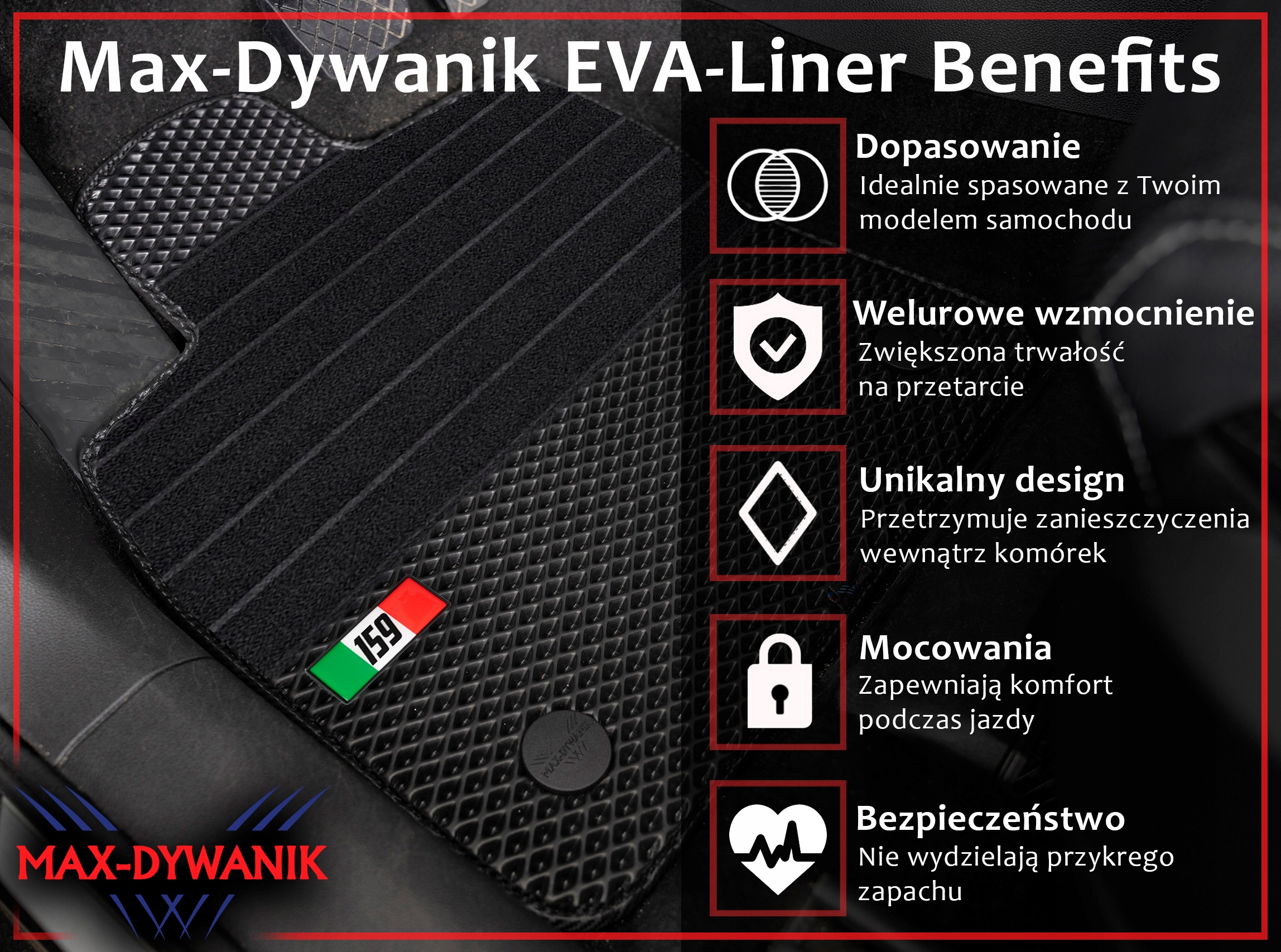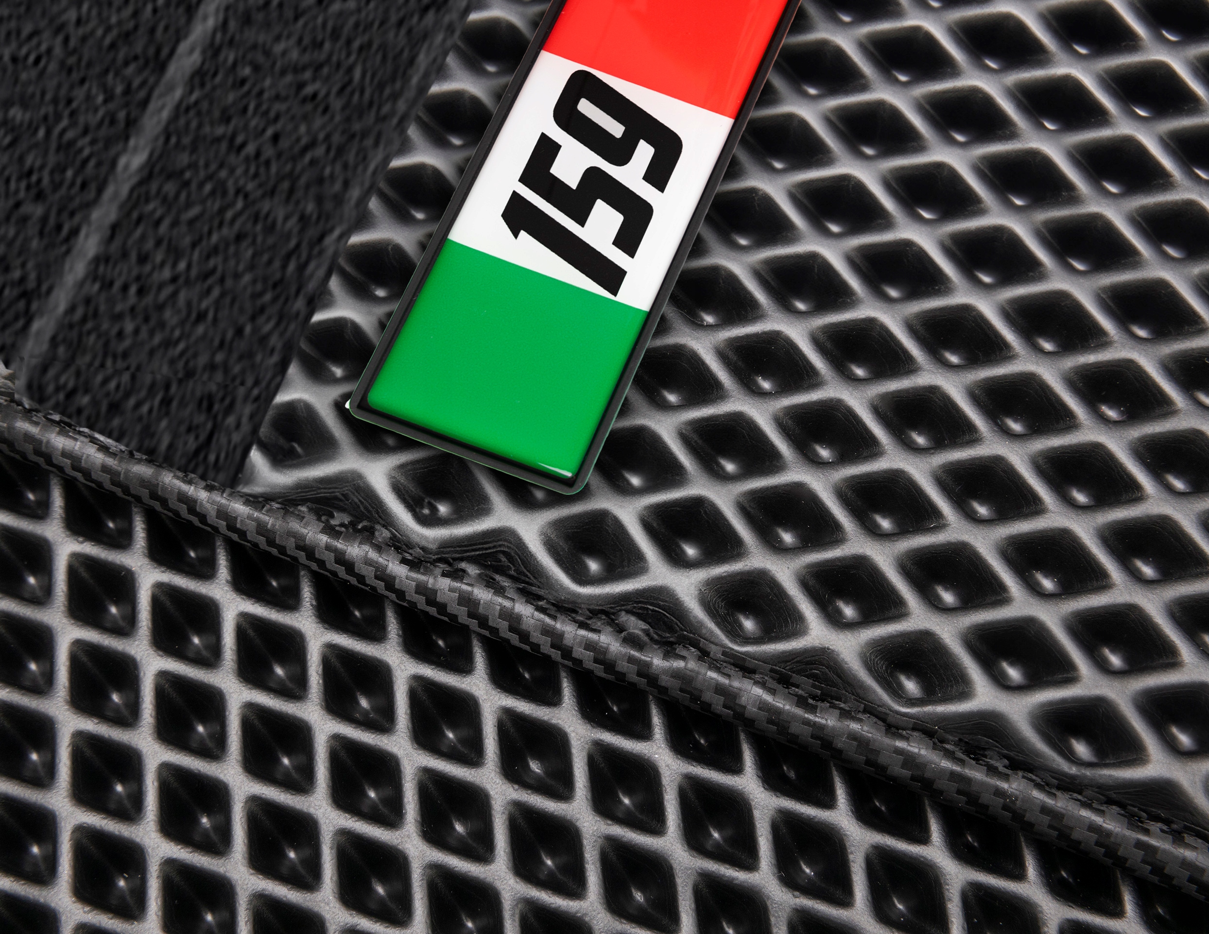Забезпечте свій автомобіль найвищий рівень захисту та стиль завдяки нашим ексклюзивним килимам Eva вічно глибокі килимки . Виготовлений з високої якості EVA пінопласту товщиною 10 мм та структури алмазів. Наші килими не тільки функціонують, але й додають елегантності внутрішніх приміщень вашого транспортного засобу. Килики були вдосконалені за допомогою спеціального вбудованого велюру арматури третього покоління на килимі водія, що збільшує силу килима при стиранні. Ми також додали гелеровані емблеми 159 з італійським прапором , розробленим Макс-Діваніком, який підкреслює появу килимів.