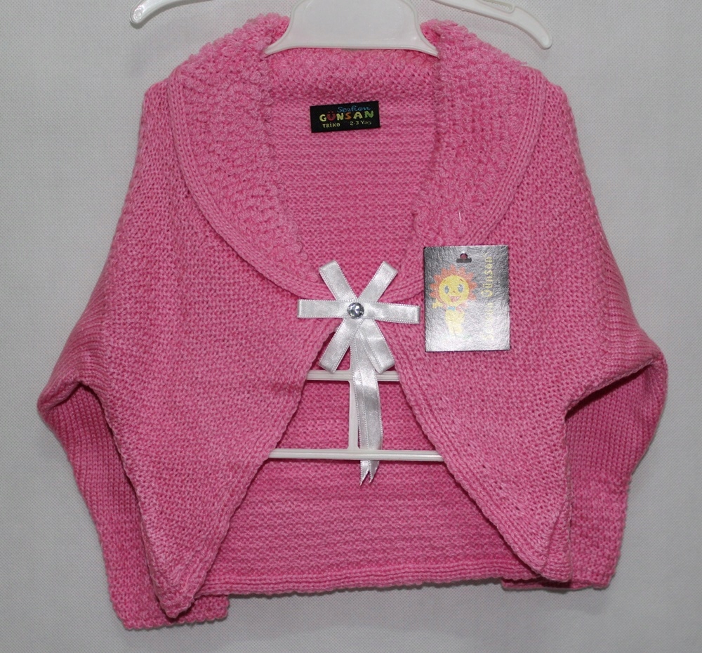 Світло-рожеве болеро-светр. Застібається на закриту шпильку з бантом і цирконом. Виготовлені з акрилу, виконані різними швами. Напівкруглий перед, рукава реглан з манжетом у вигляді болеро. Шалевий комір під горловину.