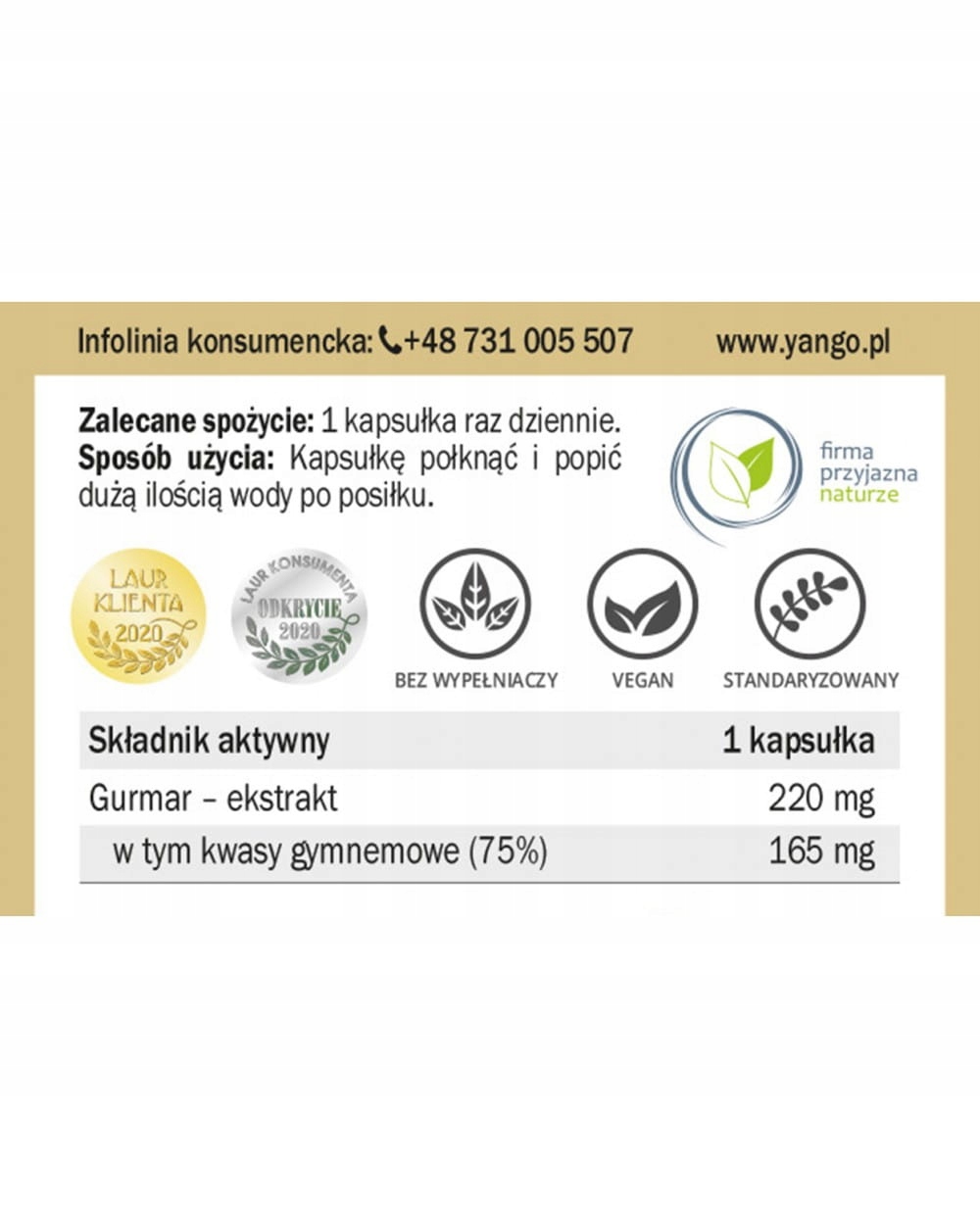 Інгредієнти: екстракт гурмару (Gymnema sylvestris), стандартизований для вмісту мін. 75% гімнемічних кислот Склад капсули: рослинна целюлоза (вегетаріанська)