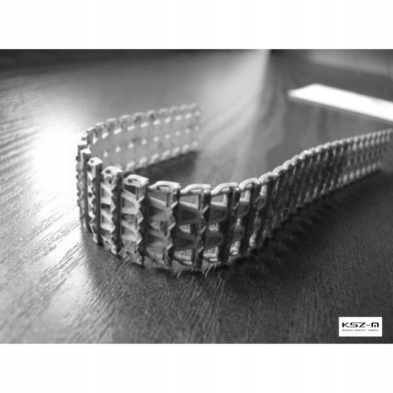У набір входять готові трекові смуги з лазерним гравіюванням і вирізанням. Це повна гусениця, виготовлена з одного шару картону потрібної товщини. Завдяки правильно спланованій і перевіреній на практиці структурі контакту ланок, «завиток» на натяжних або ведучих колесах не є викривленням, а реально розривається - самі ланки залишаються плоскими, утворюючи проміжки між ними. Прикріплюємо до смужок «сходинки» протектора (див. фото) і направляючі зуби і все фарбуємо. Дуже хороший ефект із невеликою роботою.