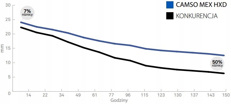 Гусениці Camso мають набагато товщий протектор, ніж більшість гусениць OEM. Зберігаючи більше гуми навколо каркаса, він був краще захищений від проколів і порізів. Це забезпечує довший термін служби та скорочення часу простою. Остаточний результат тесту: гусениці Camso MEX HXD забезпечують на 30% довший термін служби.