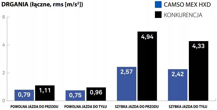 У всіх тестах рівень вібрації гусениць Camso був на 42% нижчим, ніж гусениць OEM, незалежно від швидкості та напрямку руху.
