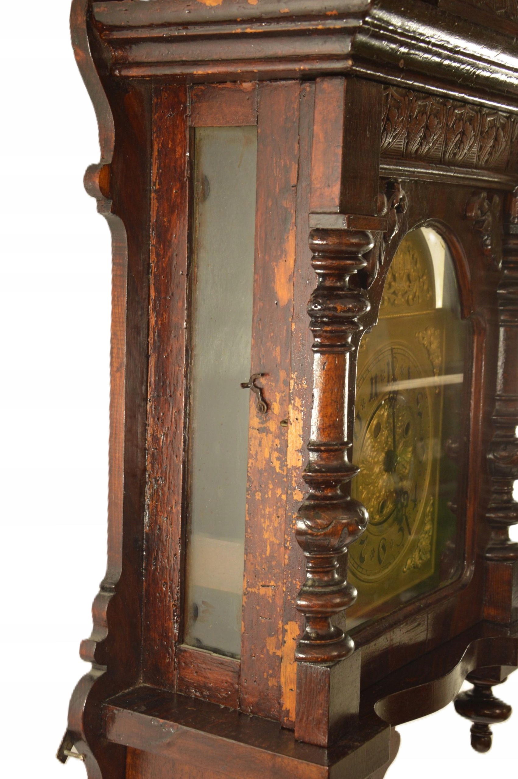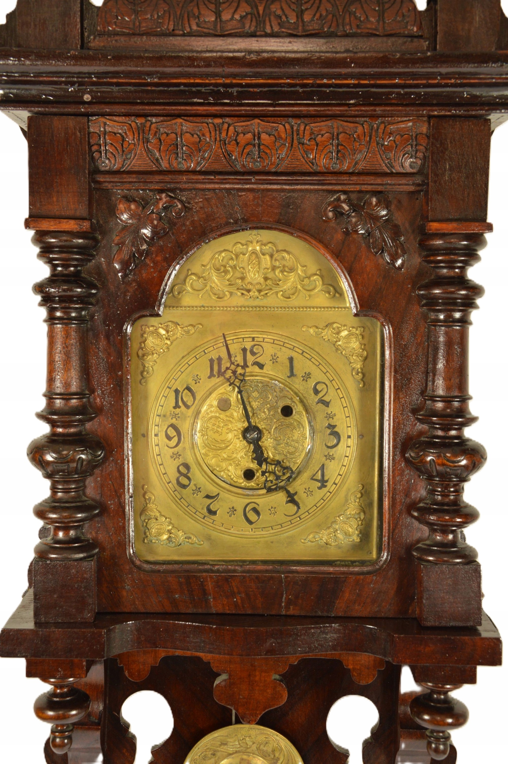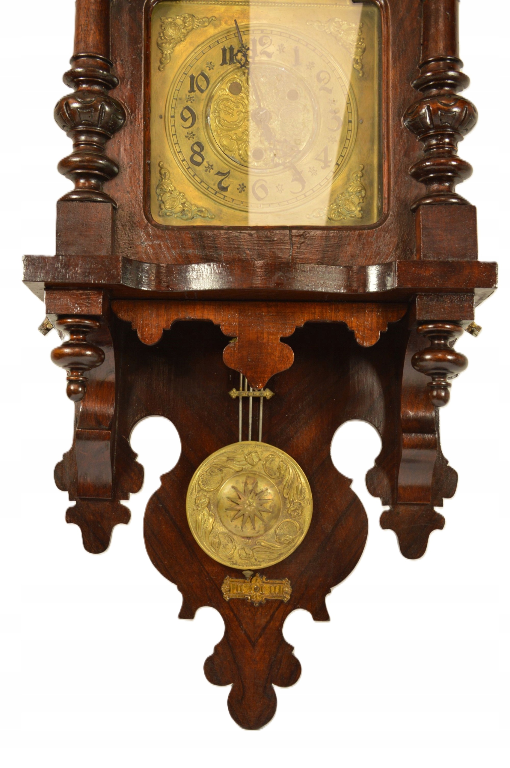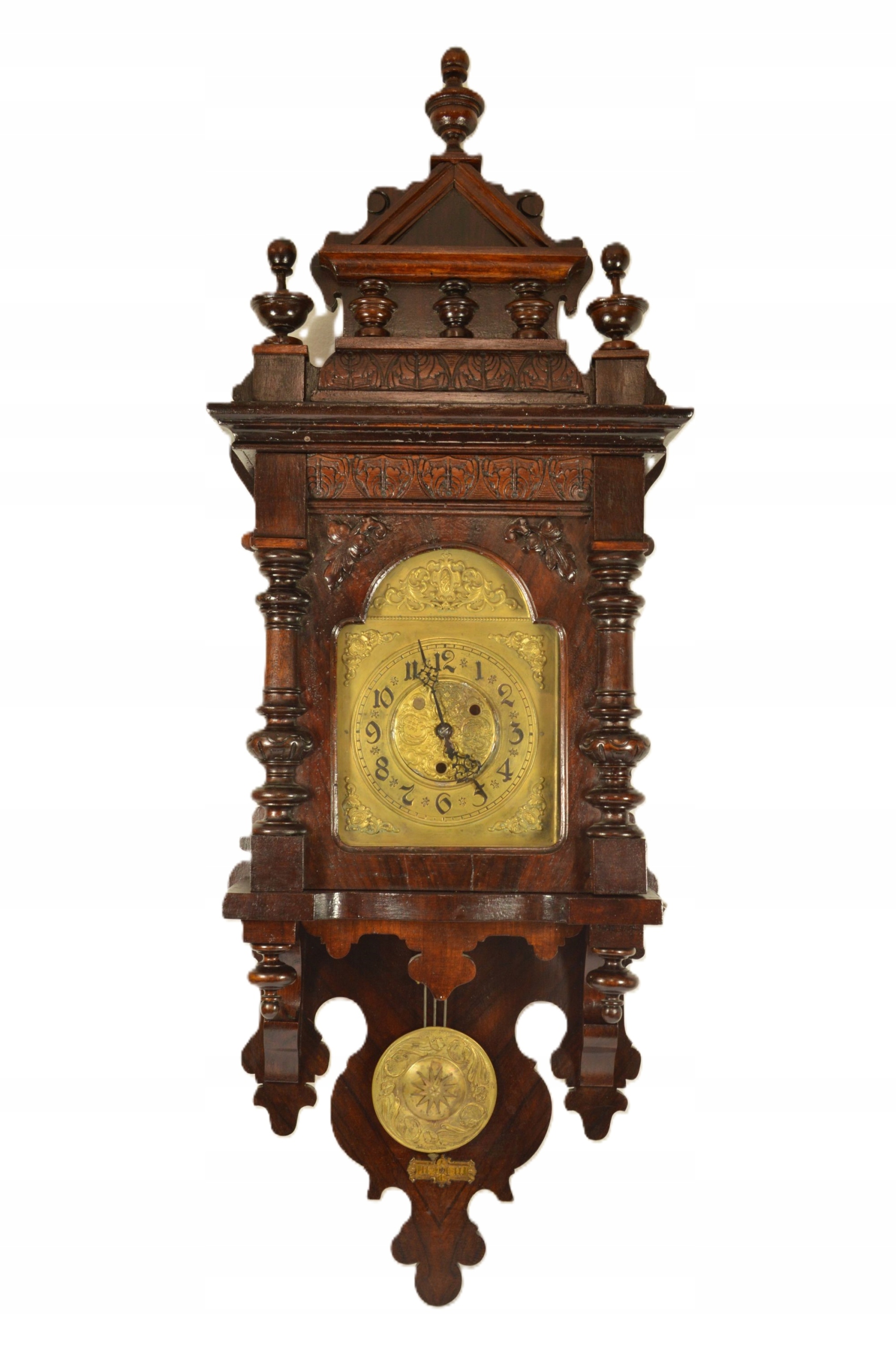 Красивий, старий, великий, висячий годинник Густав Беккер. P48 Механізм - функціональний, у комплекті з маятником та звивистим ключем. Внутрішня частина щита з дірками для звивистих вільних, була вторинною. Повна скриня, що відповідає видимам слідів використання, подряпин, була вторинною лакованою.