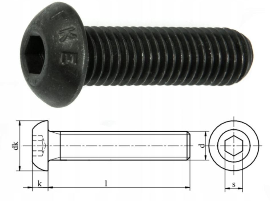 Гвинт із круглою головкою з шестигранною головкою та різьбою по всій довжині хвостовика згідно ISO 7380-1, виготовлена зі сталі класу 10.9 без покриття. Розміри шурупів на кресленні відповідно до наведеного вище стандарту.