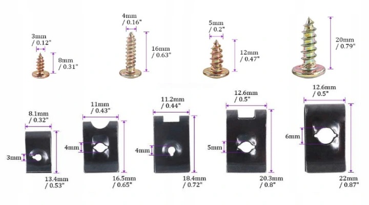 Набір складається з 150 штук гвинтів і шайб для кузова, розміром від M3x8 мм до M6x20 мм. Гвинти та шайби поміщені в зручний сортувальник.