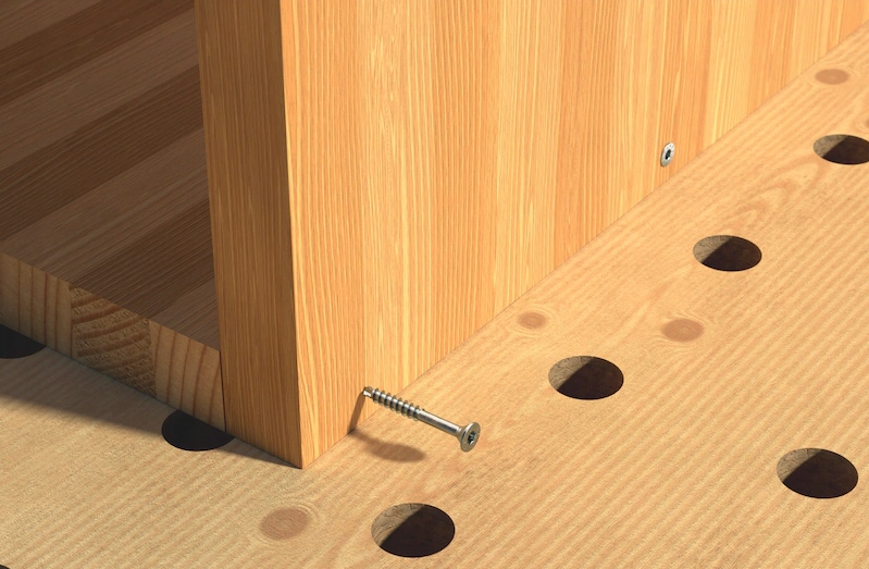 Універсальні шурупи ASSY PLUS із неповною різьбою, плоскою головкою та різцем для точного кріплення біля країв, без попереднього свердління, з’єднання дерево-дерево в сухих і вологих приміщеннях. Ці гвинти використовуються для з’єднання меблів і корпусів ящиків без свердління та зенкування.