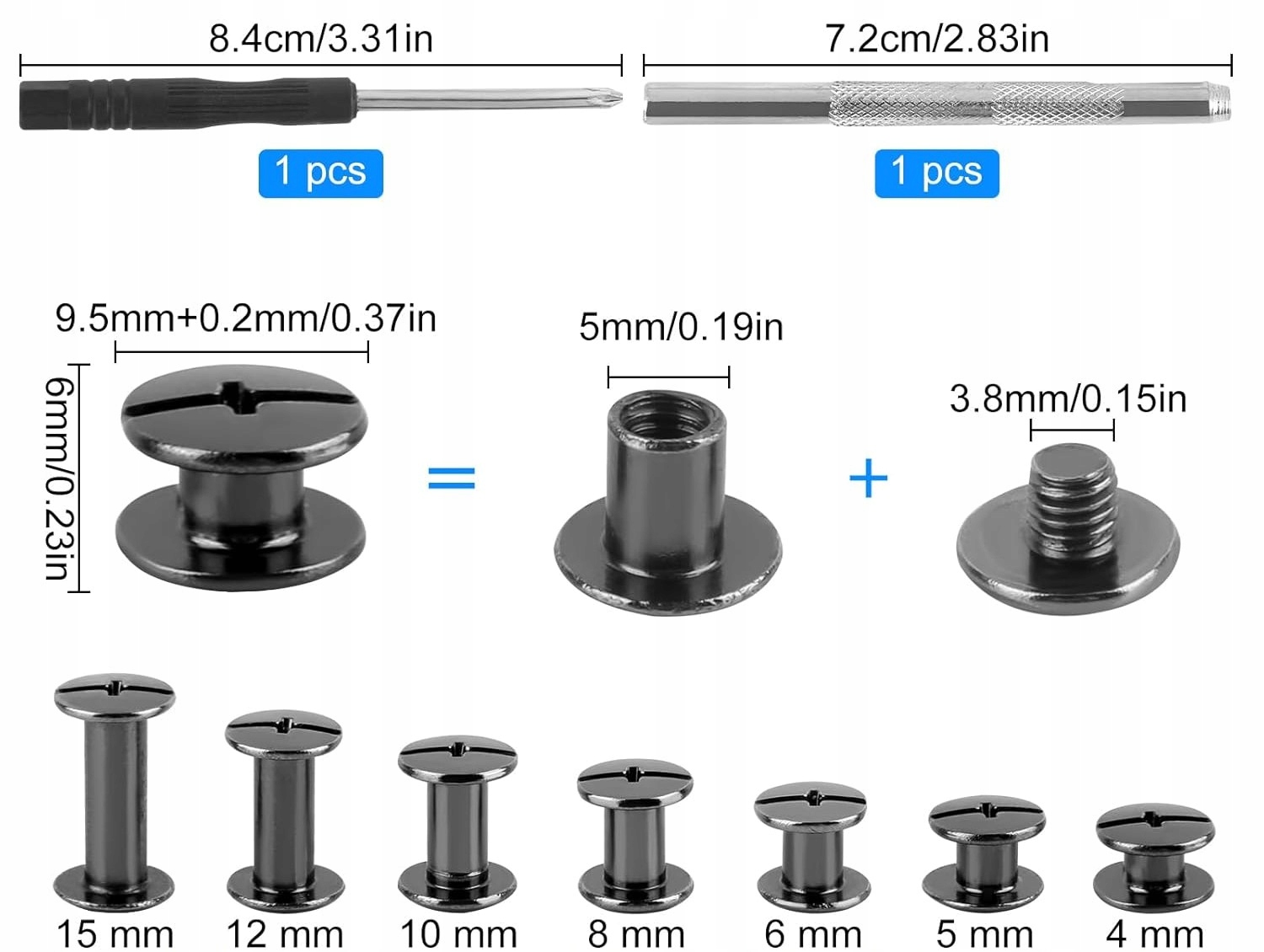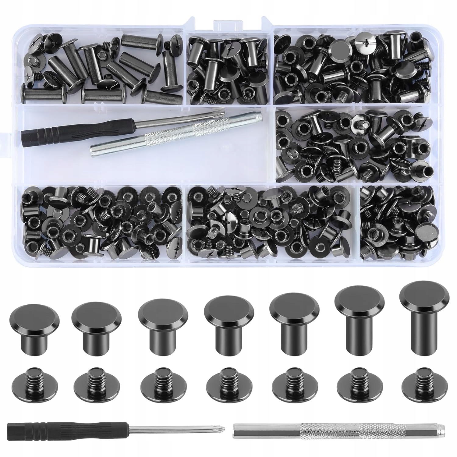 Професійний набір шурупів для книг, сумочок, ременів та шкіряних виробів містить аж 120 шурупів Chicago 7 розмірів: