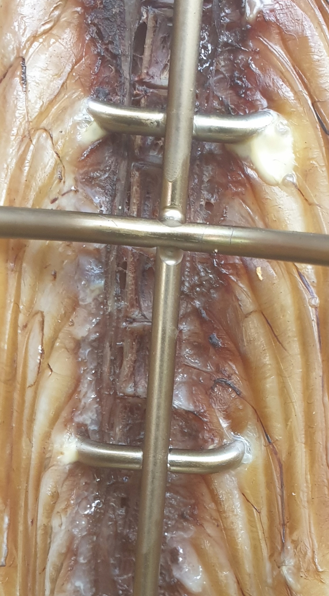 Пропонуємо гачки власного виробництва типу H-328-D, з великою регульованою прокладкою, яка дозволяє розширювати або звужувати мочки риби. Просто стисніть або зігніть вудилище буквально пальцями і все. Гачки також мають три подвійні лопаті, які дозволяють охопити хребет, що запобігає відриванню м'яса від хребта під час гарячого копчення, і додаткову сьому лопатку для встромлення в хребет риби. Гачок рекомендований для копчення цілої великої риби, такої як осетер, лосось, щука, судак, сом та ін.