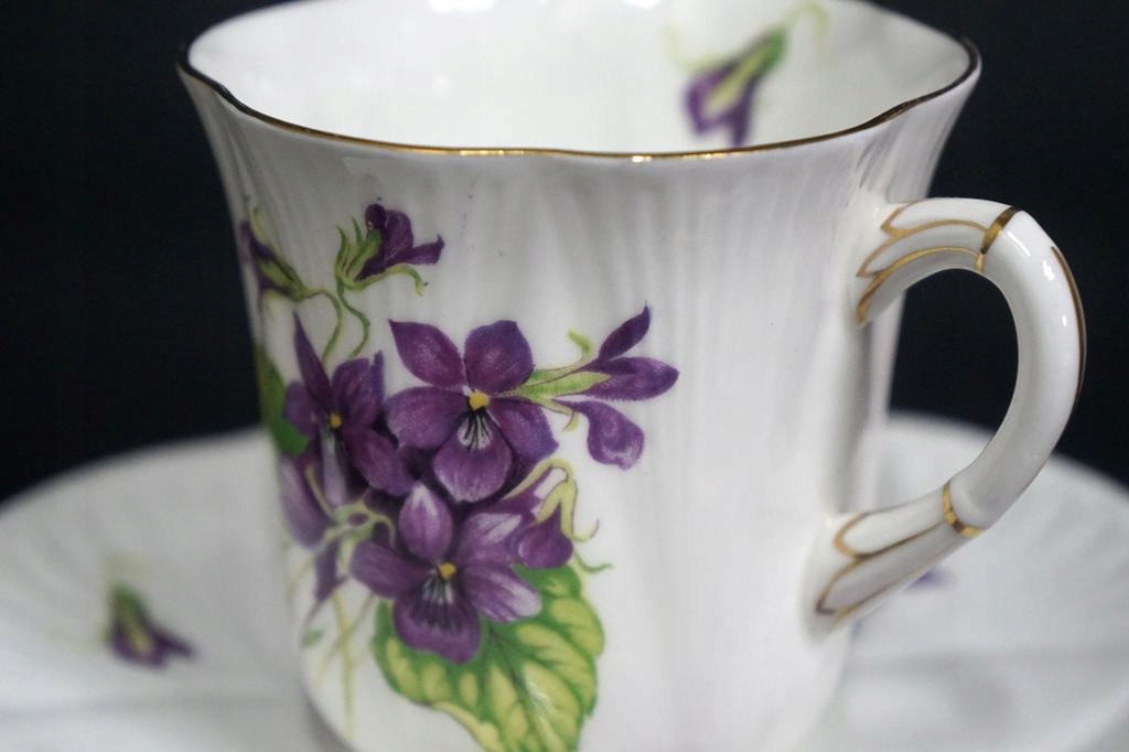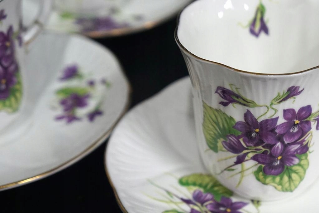 Парцелянові чашки, прикрашені красивими фіолетовими мотивами.