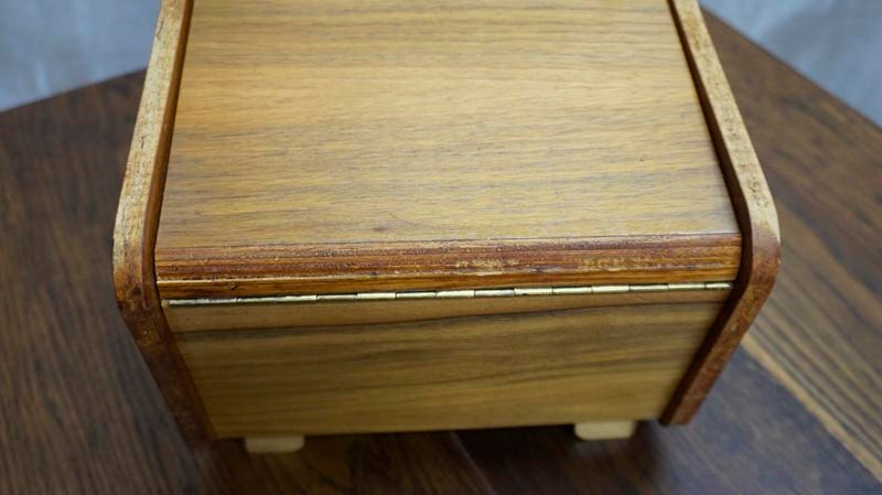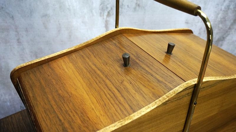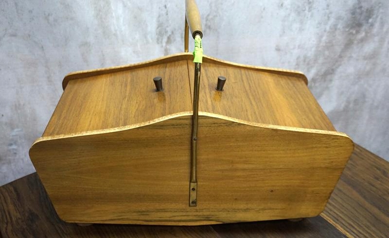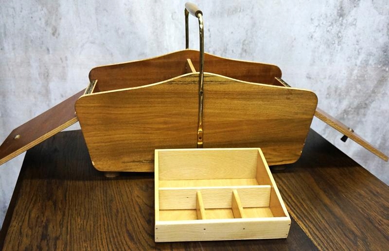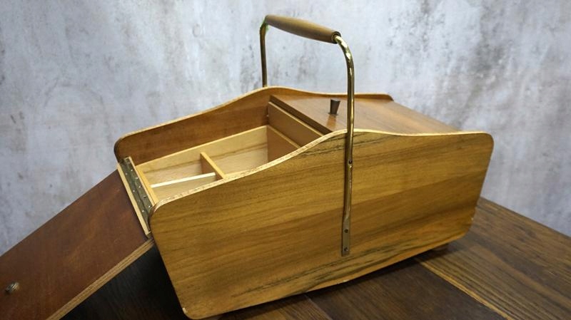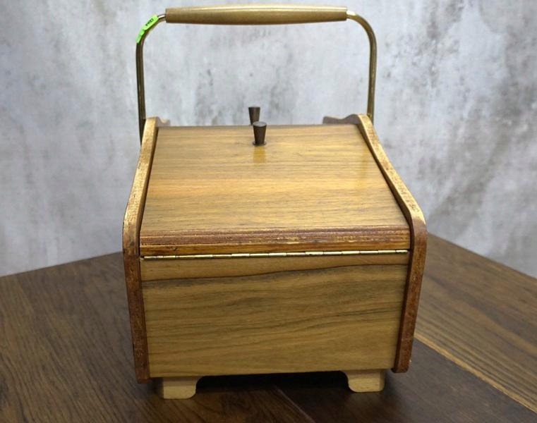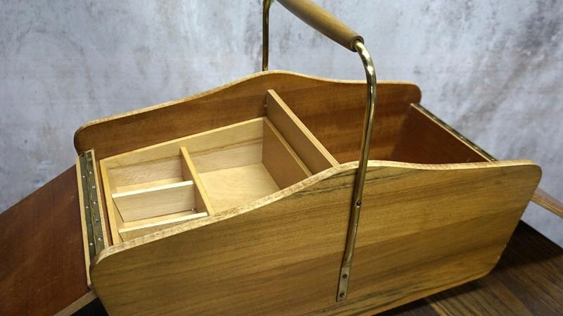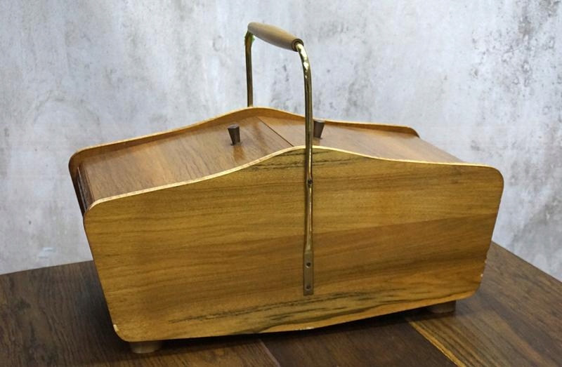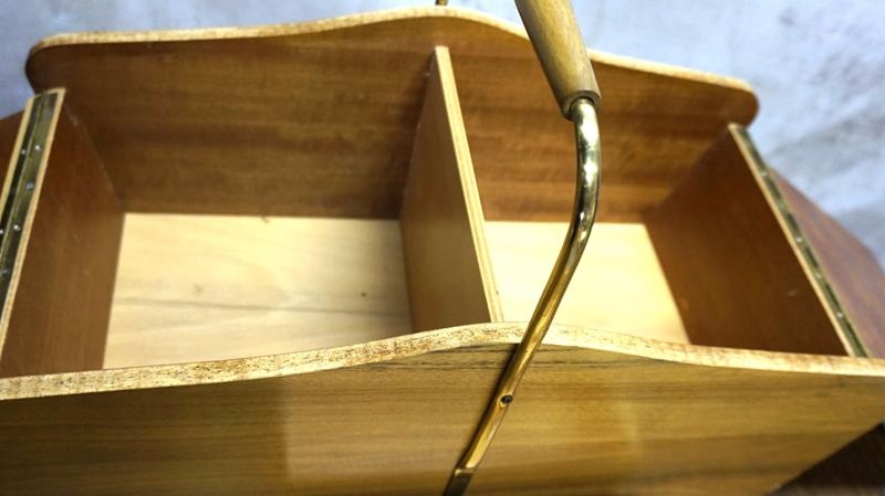Коробок для ниток у формі коробки-мішка з ручкою, виготовлений з дерева, меблевого щита з дерев'яним шпоном і оздоблений латунними елементами.