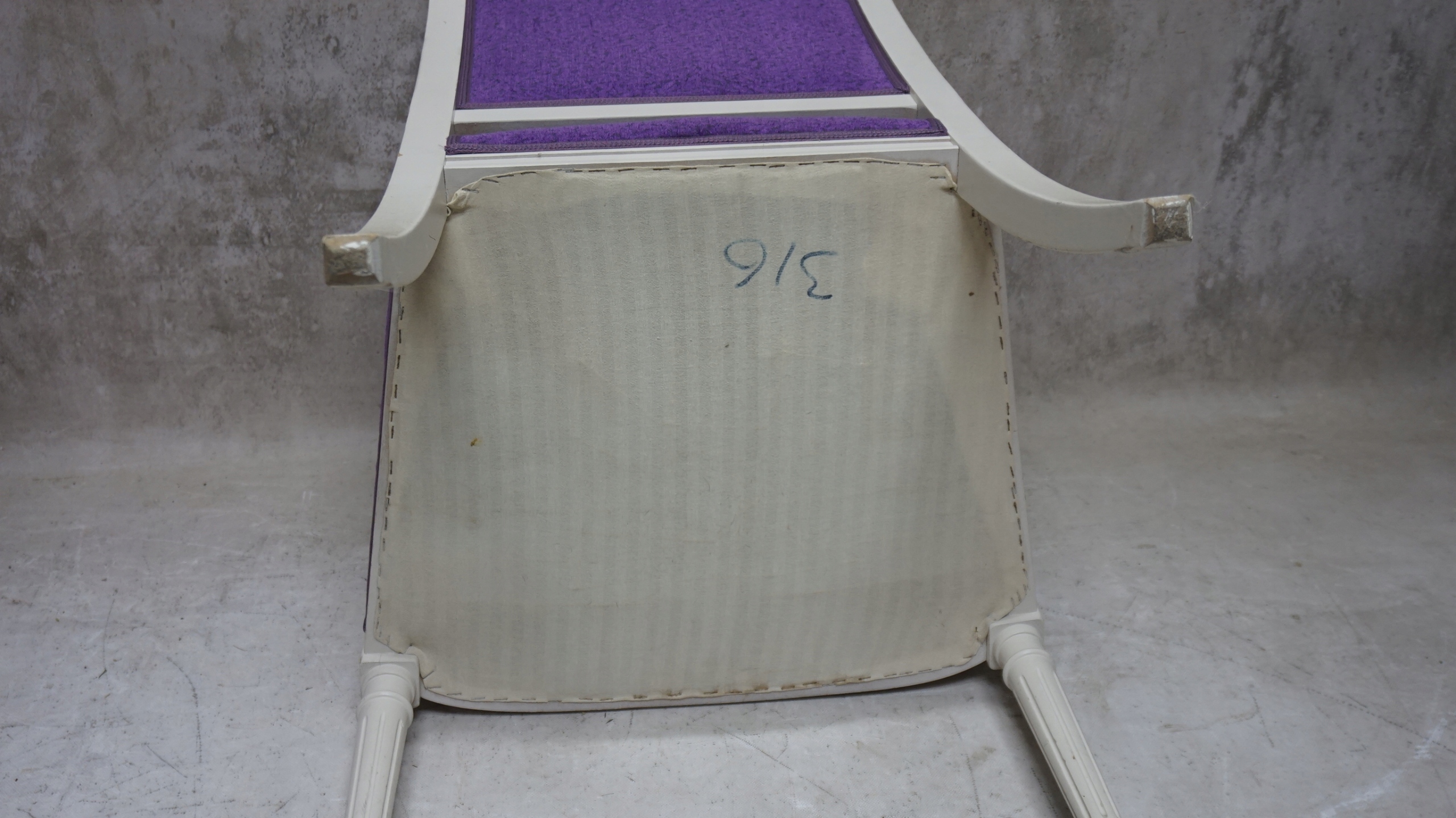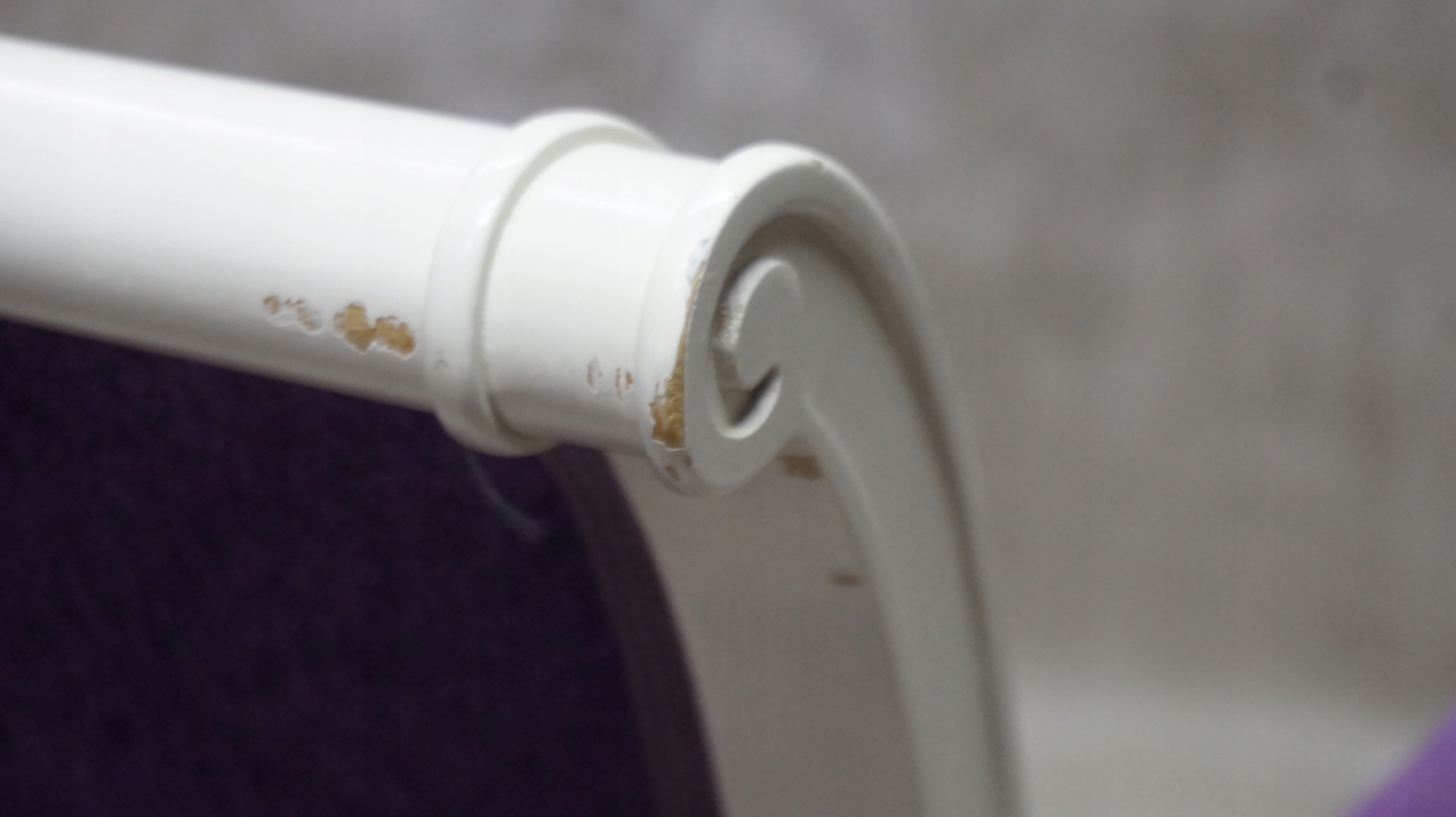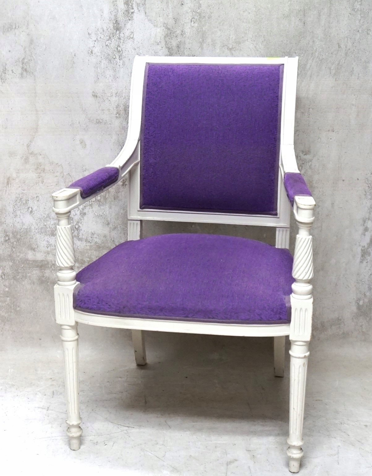 Крісло стійке, гарна оббивка фіолетового кольору без дірок, є плями, саме сидіння не сиділо на губці для косметики. освіження.