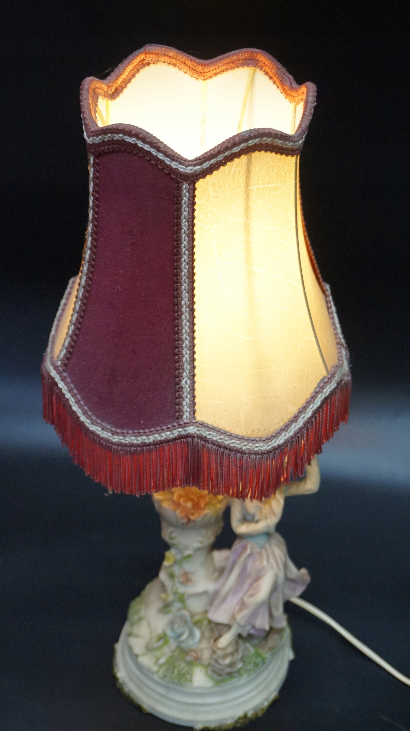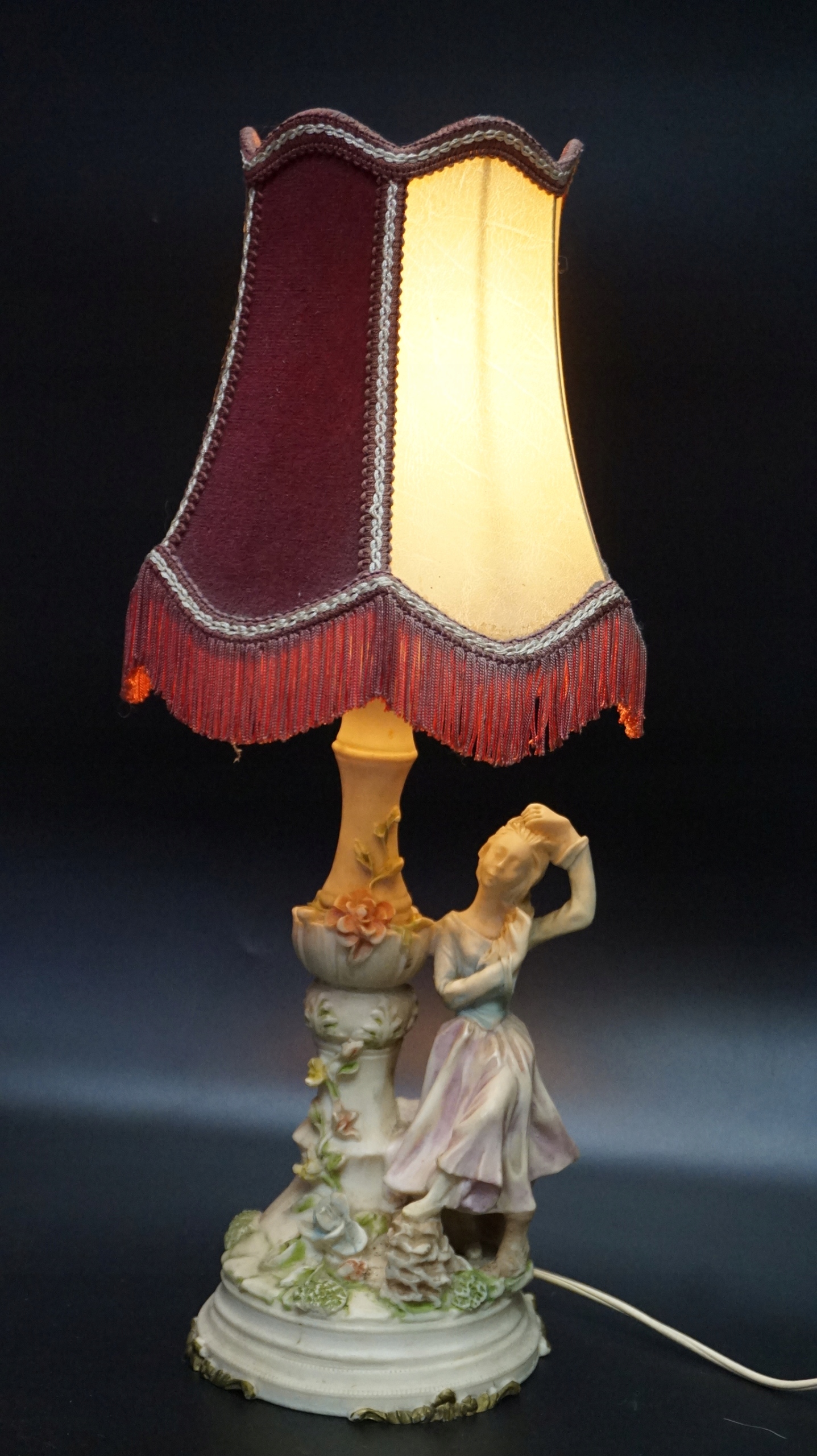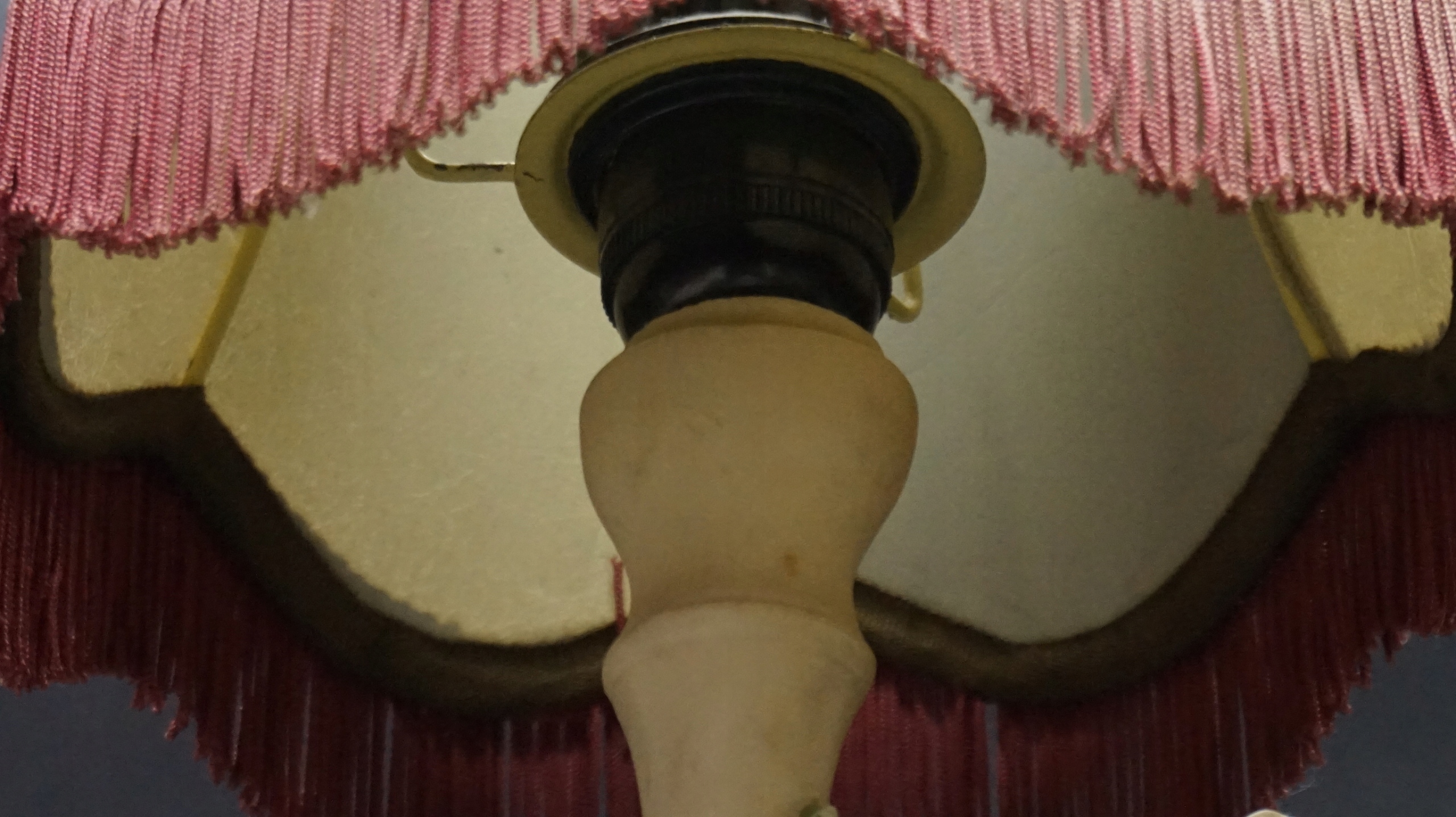 На високій декоративній колоні, тримачі лампочки та абажурі бордового та бежевого кольорів з бахромою